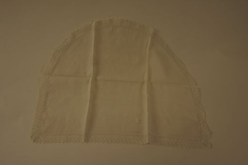 Kussensloop (kinder-), materiaal: linnen, kleur: wit, lengte 49,5 cm., breedte 62 cm., rondom 2,8 cm breed broderiekant tussen de naden genaaid, geborduurd monogram JHB (staat voor Houben-Brouwer), vier handgemaakte knoopsgaten, wasmerkje 12 ingeborduurd, vier linnen knopen, hoort bij 2007.02.180 ,2007.02.181 en 2007.02.182