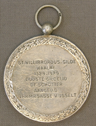 Gildepenning St. Willibrordusgilde Waalre - 1929. Slagpenning, zilver, diameter 40 mm, randdikte 2 mm. Voorzijde: Lid van schuttersgilde legt horizontaal aan om met geweer doel te treffen. Keerzijde: Omlopende krans van laurier- en eikenbladeren waarbinnen in rond veld het inschrift: “ST.WILLIBRORDUS-GILDE WAALRE 1329-1929 OUDSTE GILDELID OF SCHUTTER AANGEB. D. JHR. MR. SASSE V. IJSSELT”. Met ...