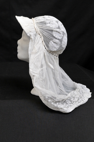 Kanten rmuts, materiaal: katoen, kleur: wit, lengte 60 cm, breedte 54 cm. Onderrand doorgestopte tule 9,5 cm breed. Bolversiering plumtuwerk. Geplooide voorstrook 6,5 cm. Gekloste ladder. Herkomst Son, gedragen door Mevr. Hendrina Lavrijssen-Ketelaars. Deze werd in 1879 in St.Oedenrode geboren en overleed in 1956 in Son. Schenking 2 mei 2005 van Mevr. Dora Gerrits-Lavrijssen, Lariksbeek 40E, ...