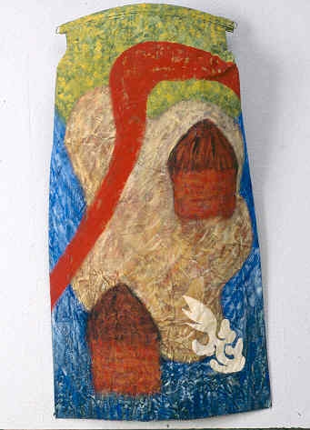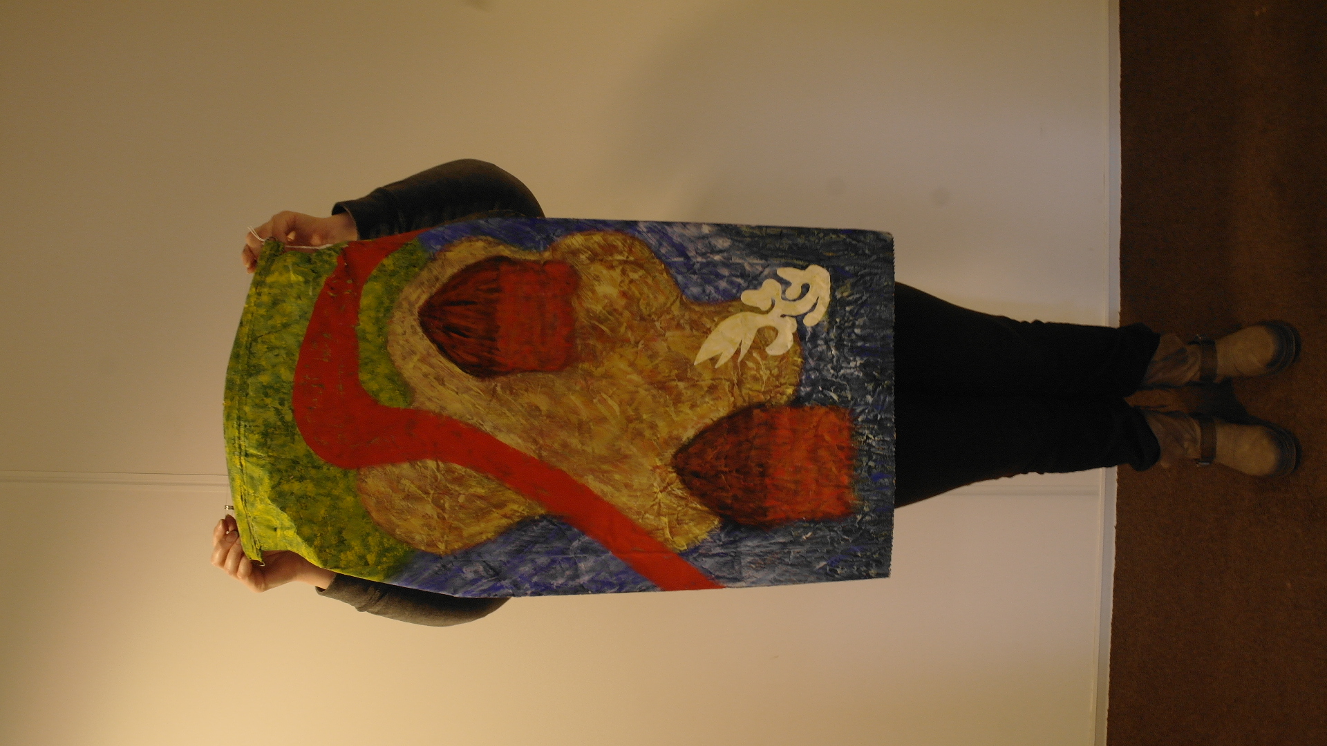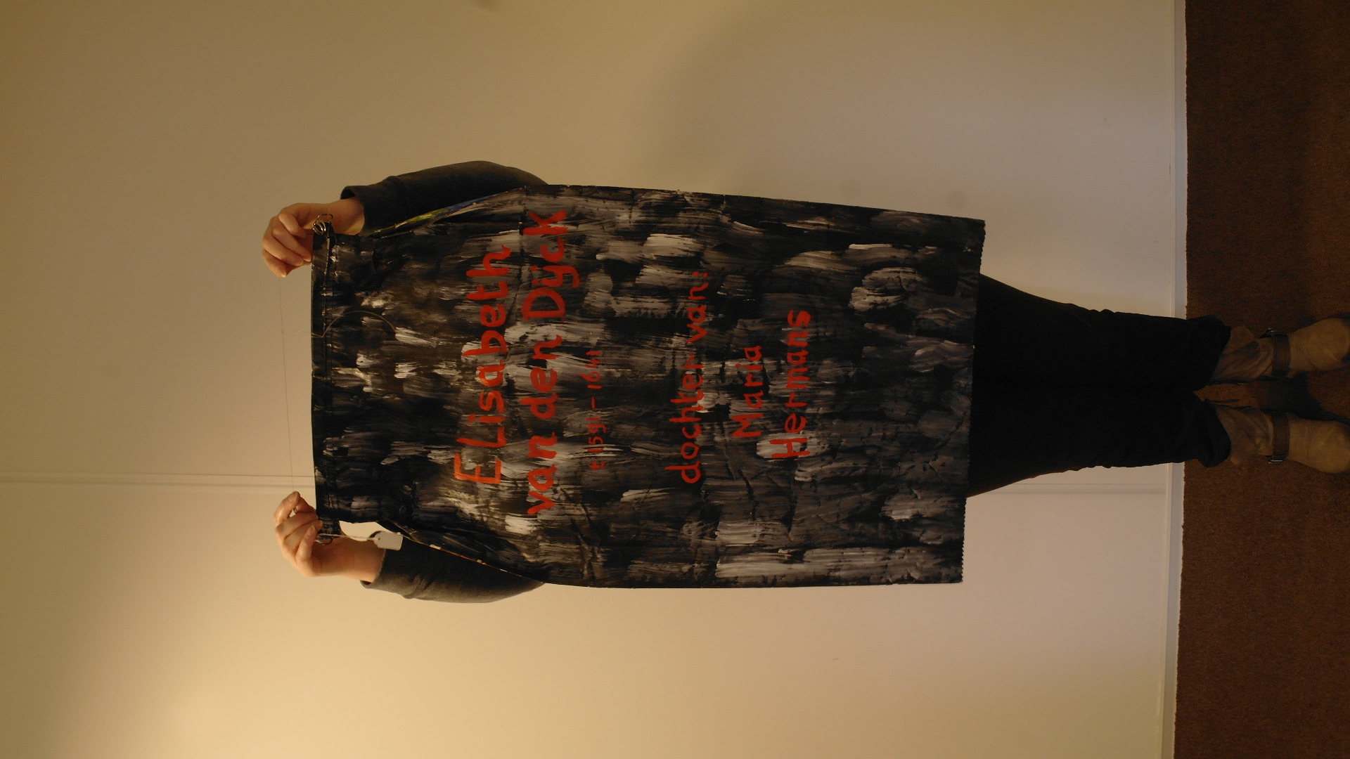 Schort Elisabeth (Lijsken) van den Dijck (ca. 1590 - 1641); project Dochters van dochters van Verrenbest. Een genealogisch beeldverhaal van Nel Verhoeven. Een exemplaar uit serie van in totaal 16 werken, schorten voorstellend, uitgevoerd in gemengde techniek