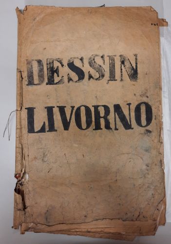 Fabrieksstalenboek, materiaal: karton/stalen, kleur: divers, lengte 61,5 cm, breedte 38 cm, karton stalenboek opschrift Dessin Livorno, met tien vellen met ingeplakte trijpstoffen van Schellekens en Marto, eind 19e eeuw