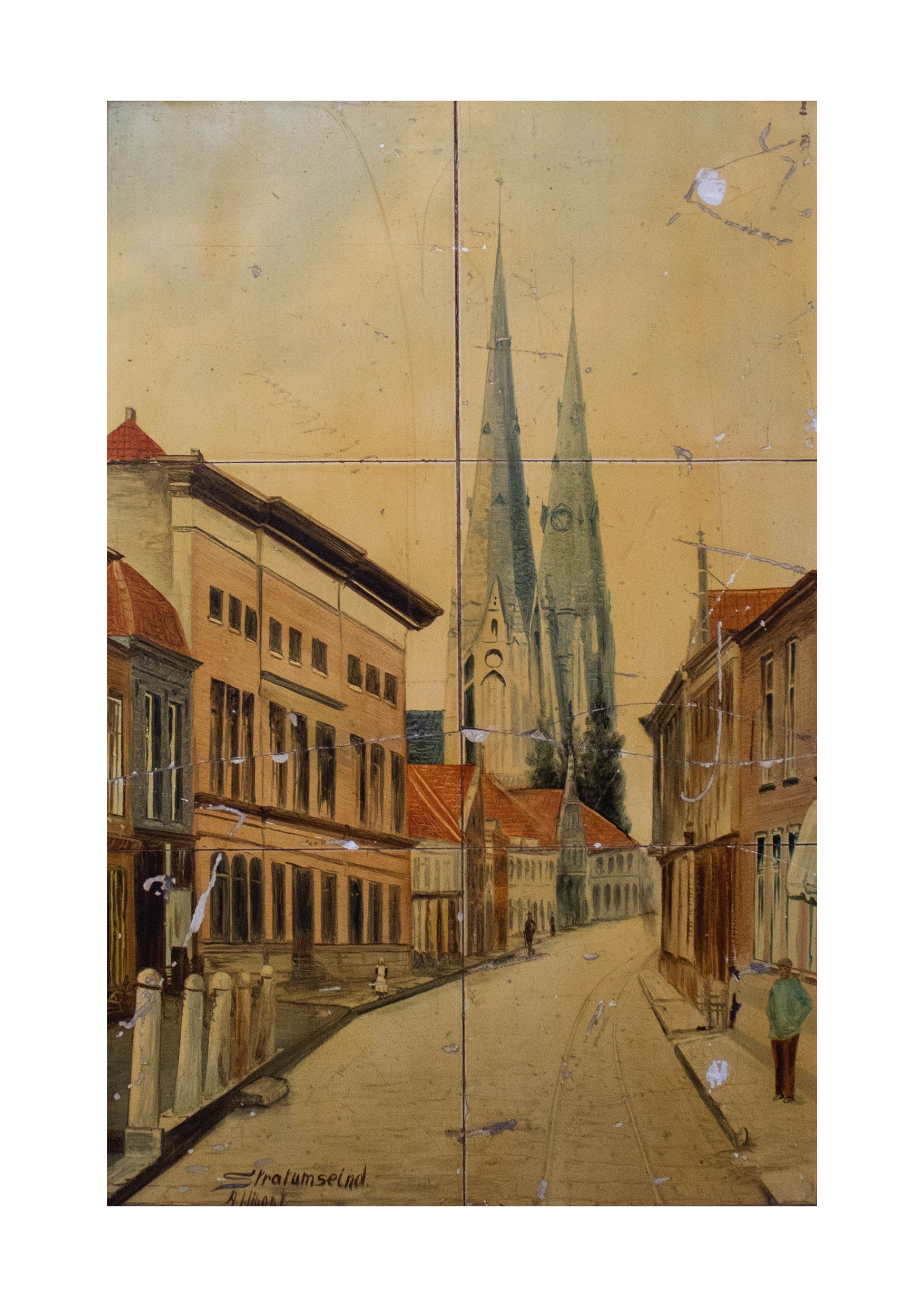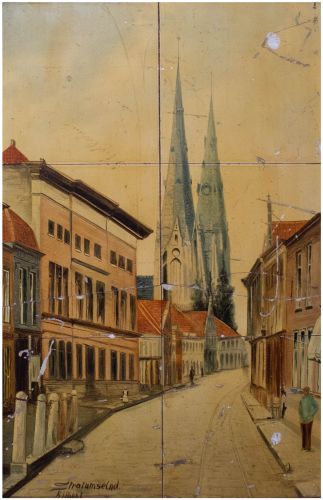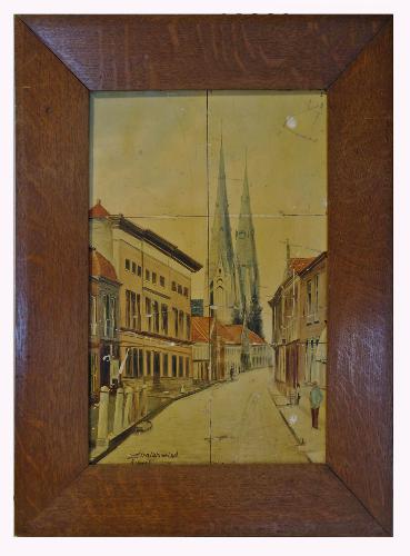 gemeten aan lijst gelocaliseerd en gesigneerd (onleesbaar) l.o. in houten lijst gevat, beschilderd tegeltableau, voorstellende het Stratumseind te Eindhoven