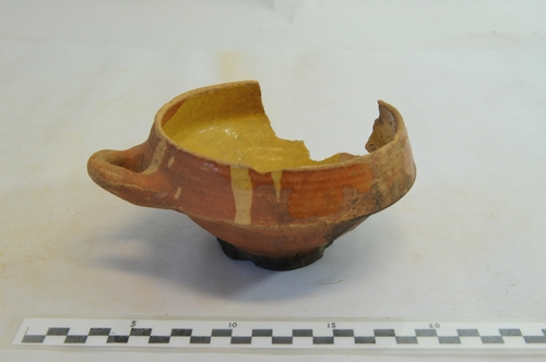 Eenorige eetkom, roodbakkend aardewerk met bruinrood glazuur op buitenzijde en aan binnenzijde kom gelig glazuur. Er ontbreekt een fragment uit de rand.