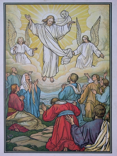 voorstelling van Christus die vanuit de hoogte (hemel) tot de apostelen en zijn Moeder spreekt