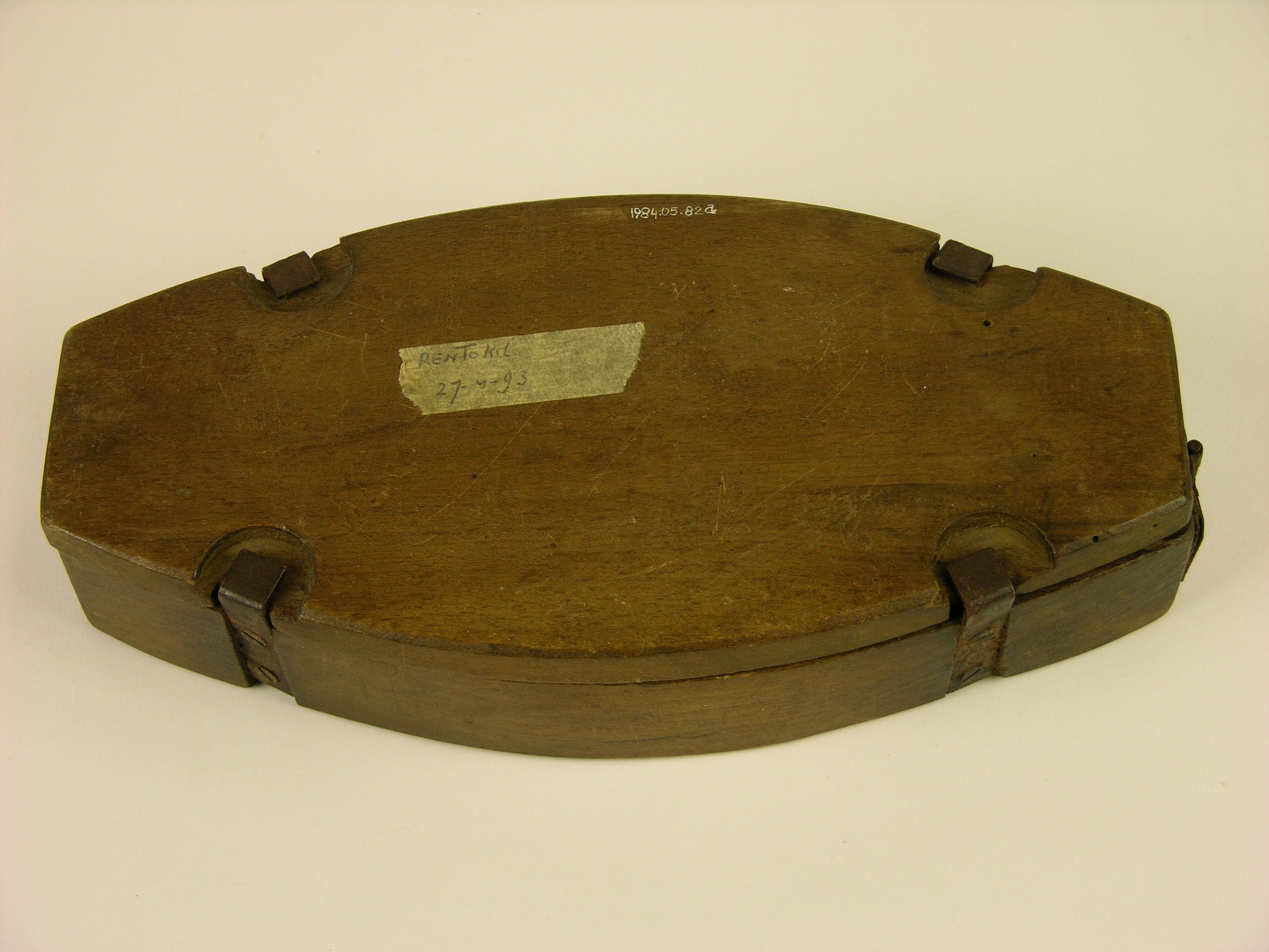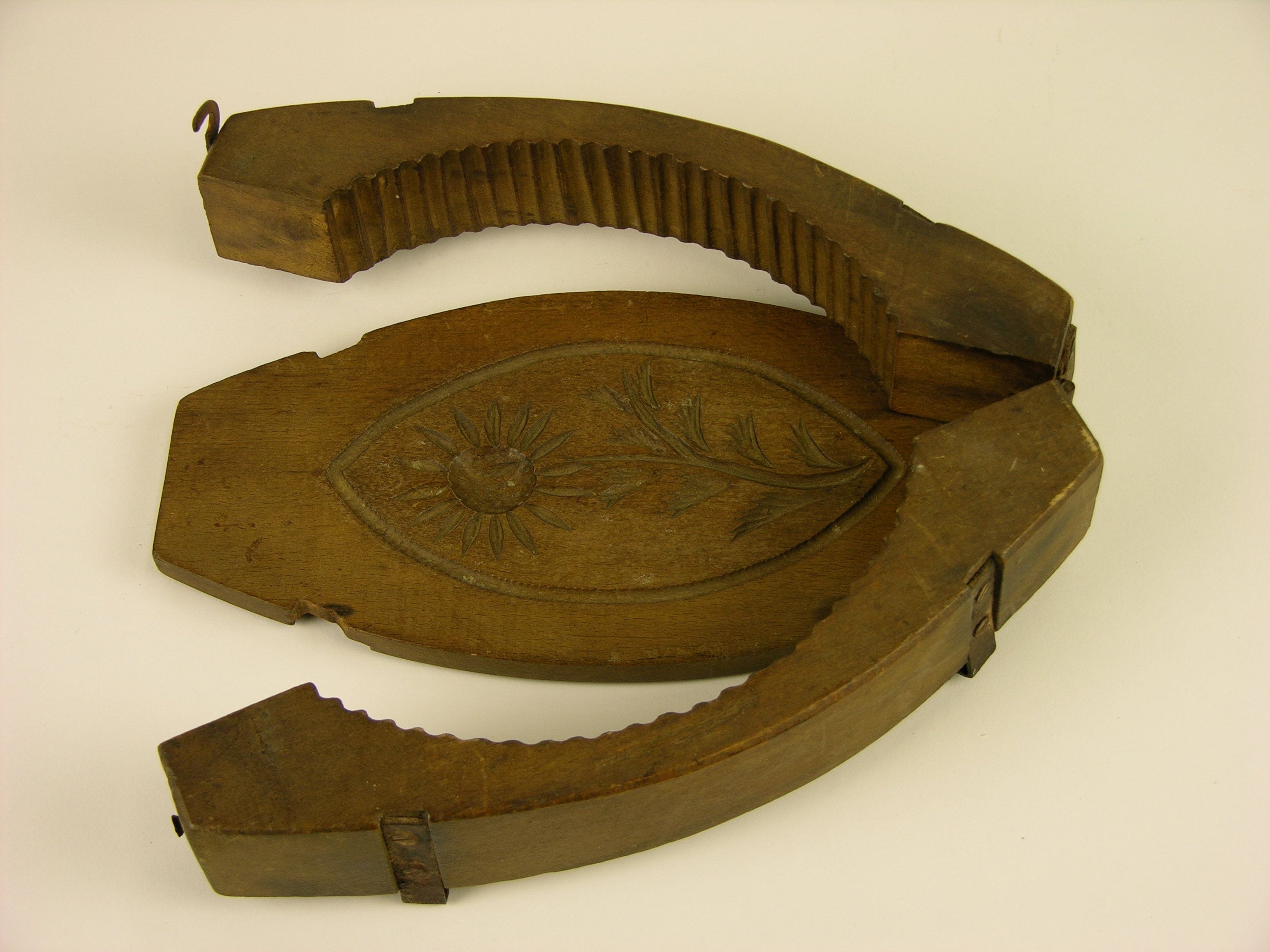 Houten botervorm (a), ovaalvormig, met ingekerfd (zonne)bloemmotief. De opstaande rand (b) met ijzeren scharnier en sluitingshaakje heeft gekerfde groeven die verticaal lopen en bestaat uit twee half ovale vormen die als opstaande rand de boter binnen de vorm houden