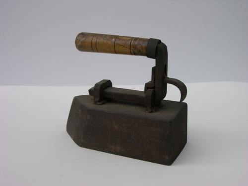 Kleermakersstrijkijzer in de vorm van een zwaar en langwerpig blok ijzer met daarop twee beugels waardoorheen het handvat geschoven is. Lift-constructie voor ontkoppeling handvat. Kleermakersstrijkbout in de vorm van een zwaar en langwerpig blok ijzer met daarop twee beugels waardoorheen het handvat geschoven is. Lift-constructie voor ontkoppeling handvat. lit.: I Ferri da stiro (flat-irons), Laura Palla, Bema ...