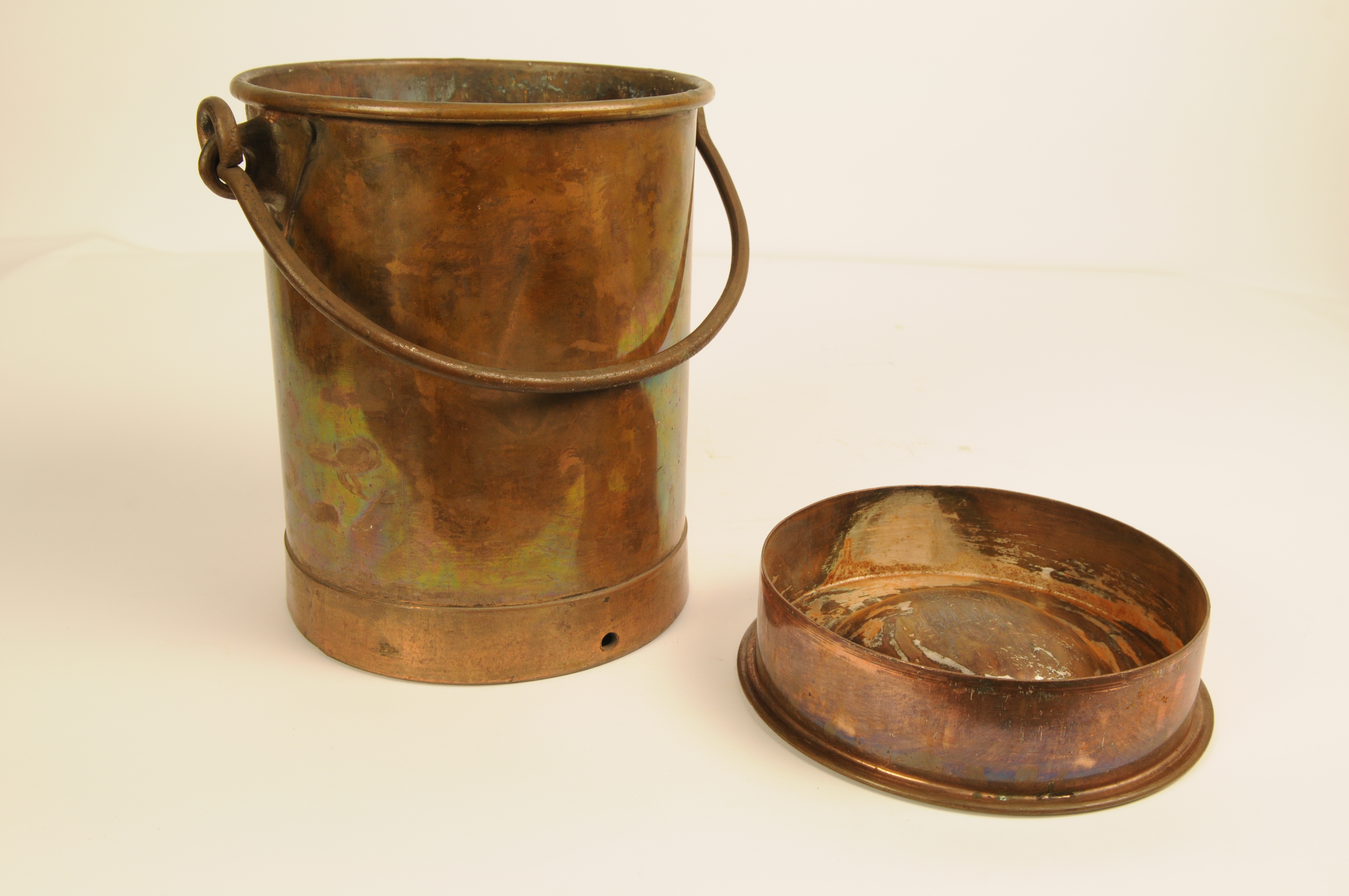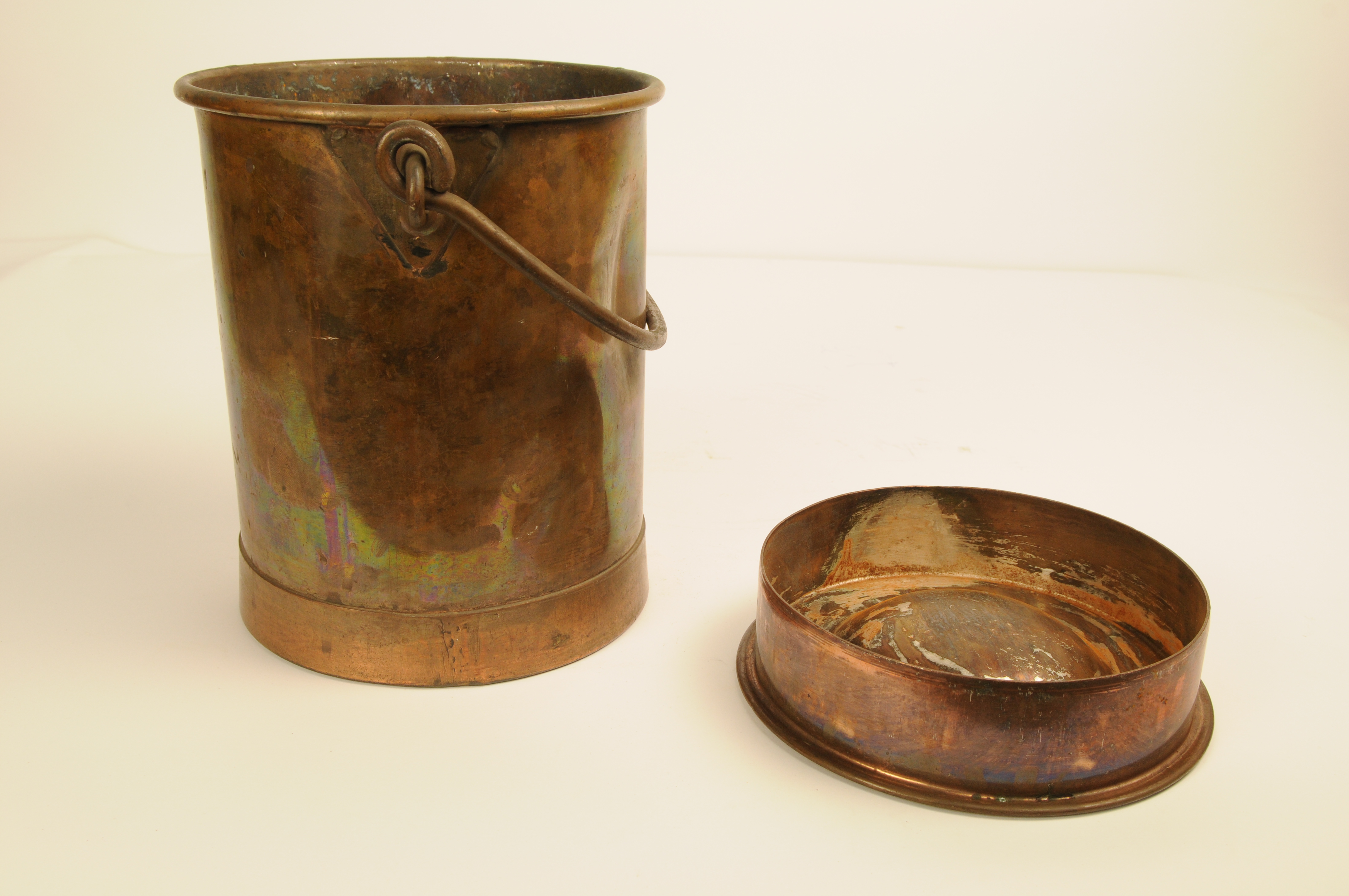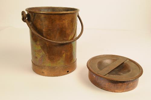 Koperen bus met plat los deksel met platte greep en zwenkbaar hengsel. Melkkan? Gemerkt op deksel: ' KI' (te lezen als ki ?)