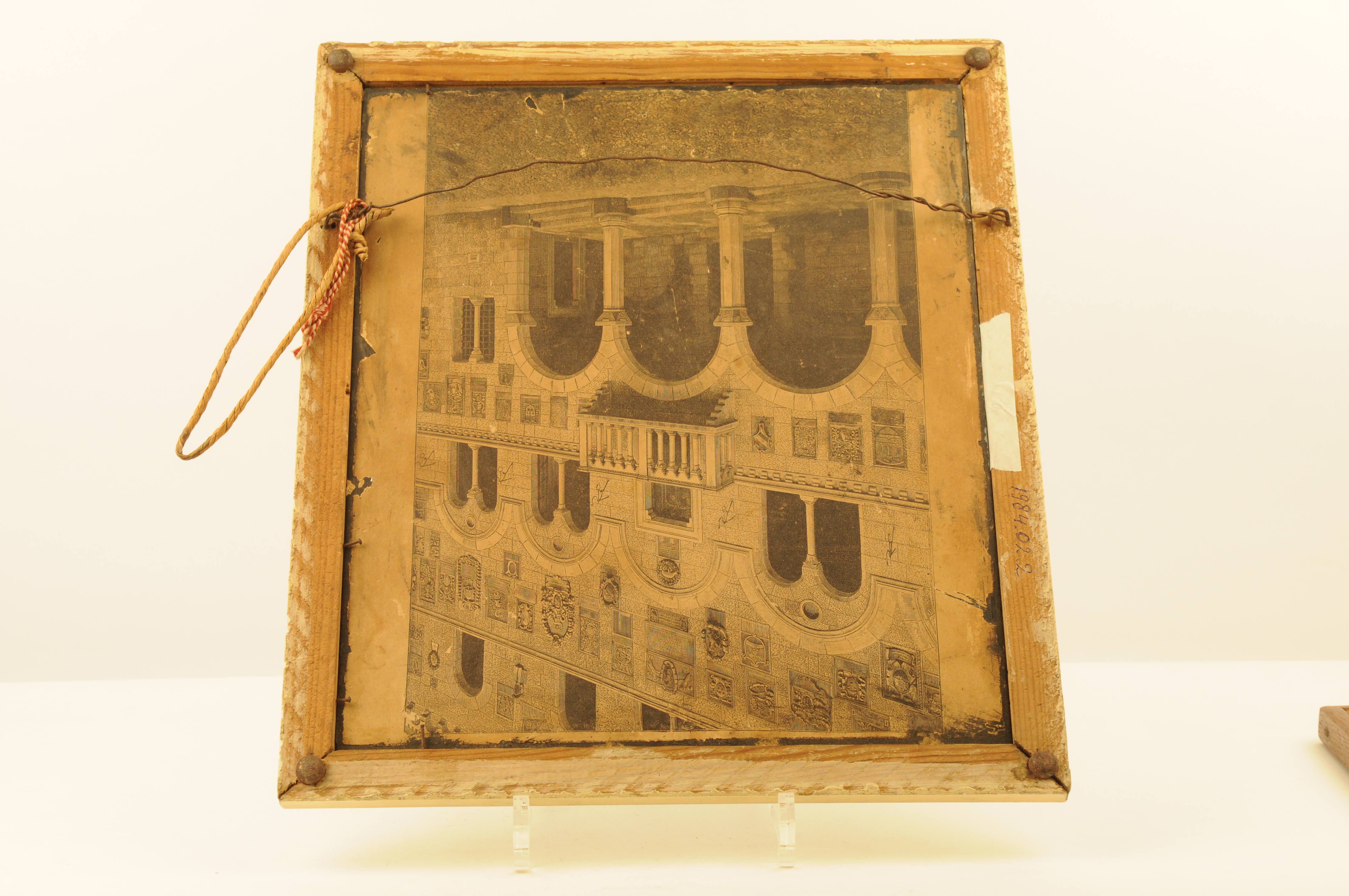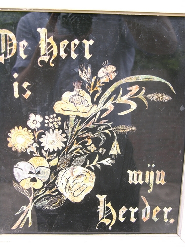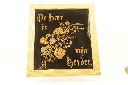 godsdienstige, vrome wandspreuk: 'De Heer mijn Herder', met figuratief groen-boeket, aangebracht op de achterzijde van glasplaat. In houten lijst. Glasplaat aan achterzijde beplakt met gravure (renaissancistische architectuurvoorstelling)