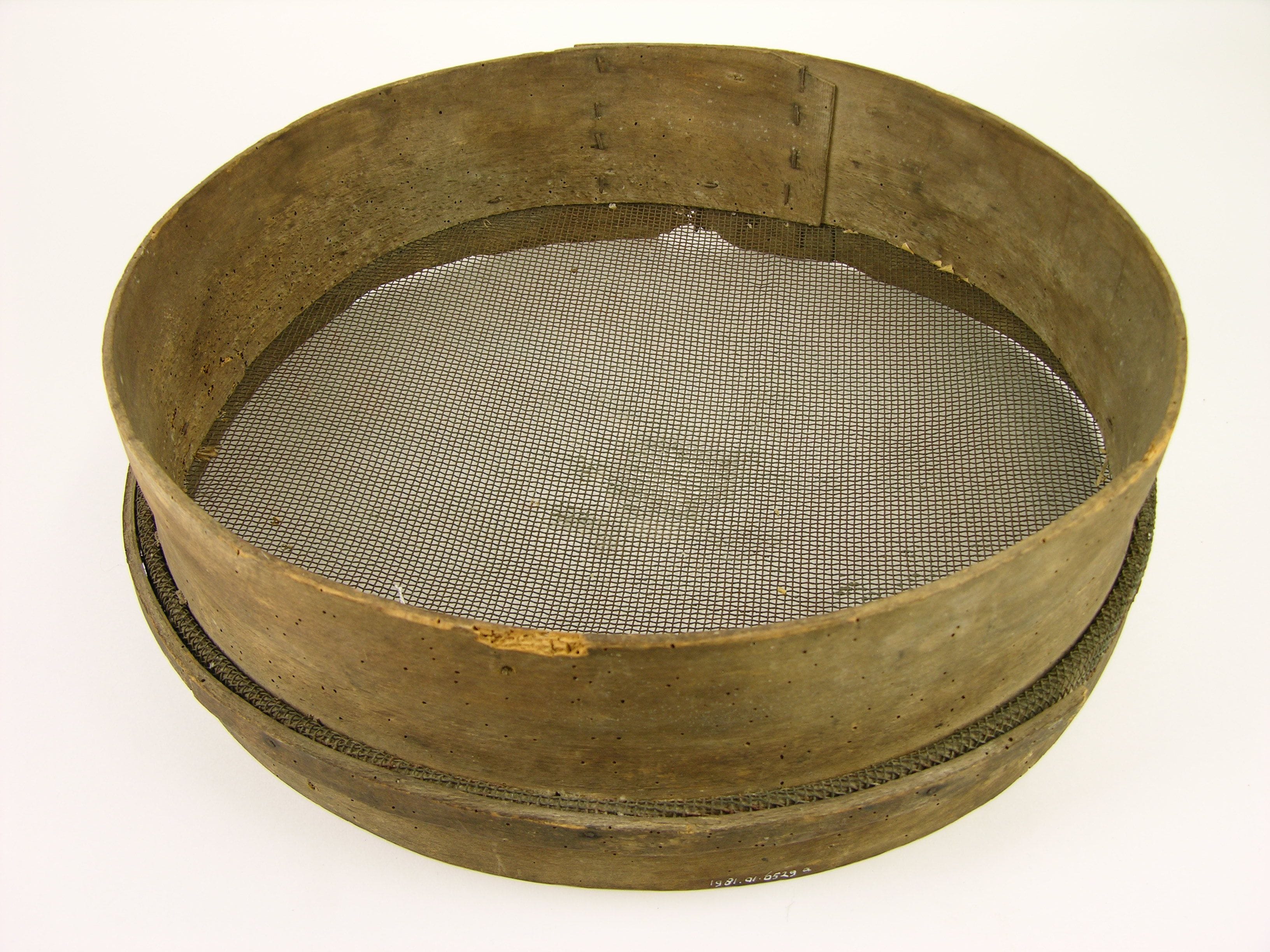 Ronde zeef bestaande uit gebogen opstaande band waarover een ijzergaas gesponnen is, dat weer middels een tweede houten bandring is geschoven