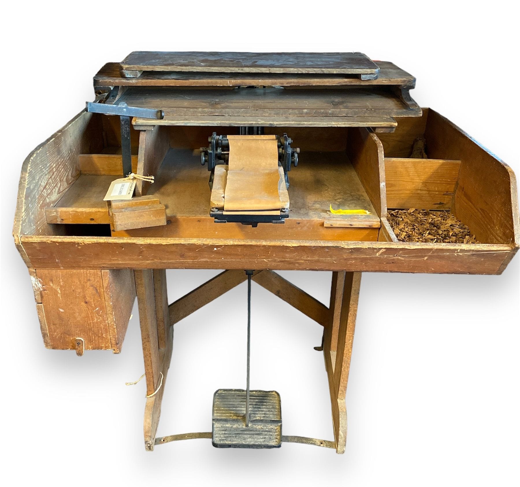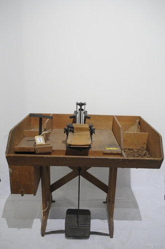 Bosjesmachine (met bijbehorend: drie bosjesvormen, bosjesvormapparaat, standaard voor sigarenvorm (plank)). Houten bak op onderstel met ijzeren pedaal die de aandrijving regelt van het ijzeren apparaat in de open bak