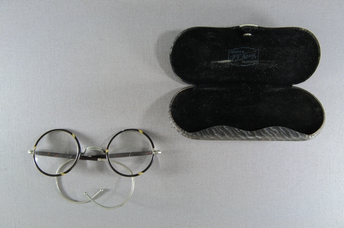Brillenkoker - 1e t/m 3e kwart van de 20e eeuw, materiaal: metaal en velours, afmetingen: 1,5 x 5,5 x 13,5 cm, metalen brillekoker, bestaand uit twee scharnierende helften (opklapdeksel), binnenin met velours bekleed, met het opschrift: 'Opticien P.J. Kooij Nijmegen'
