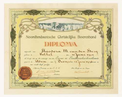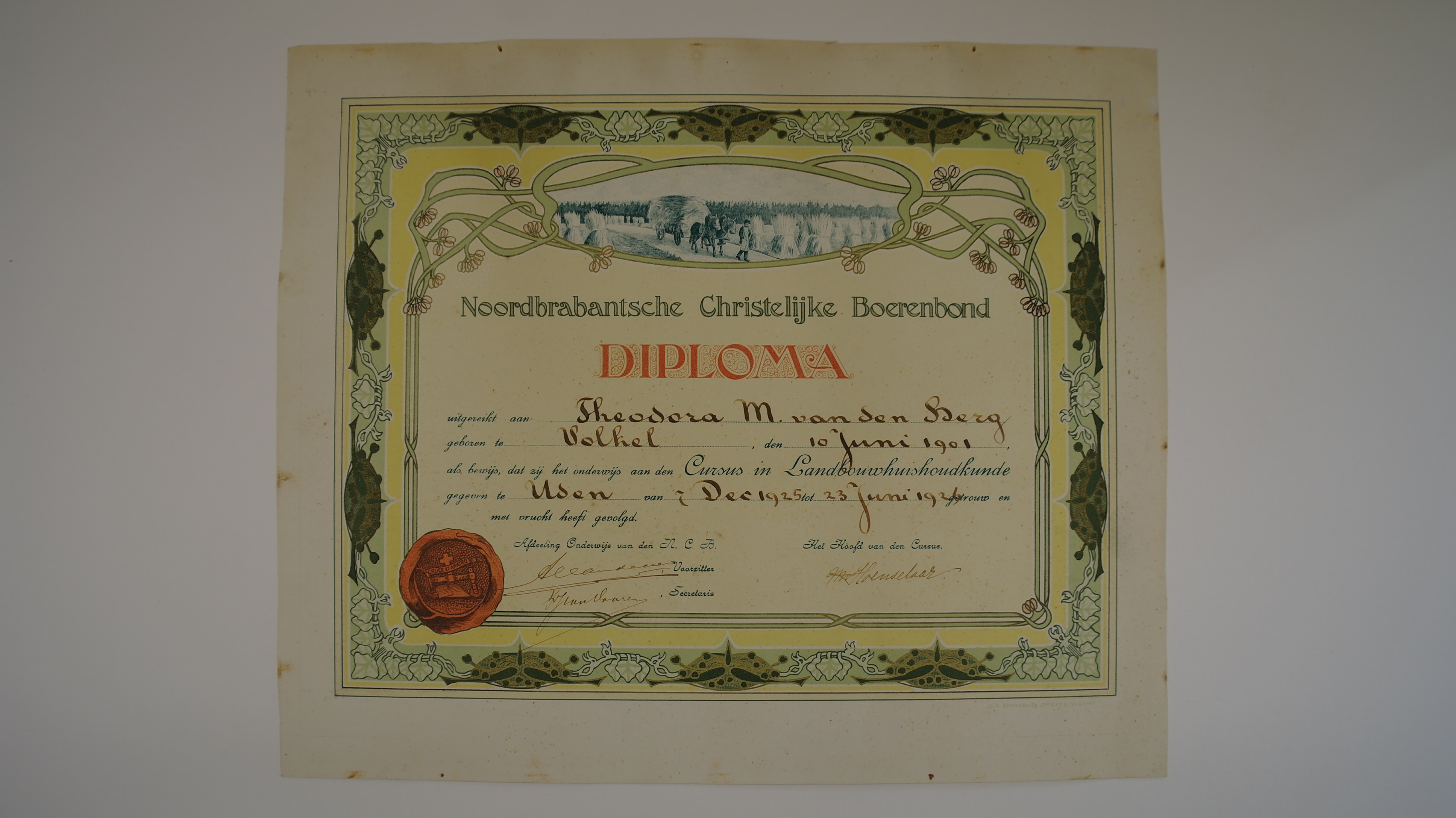 Diploma Noordbrabantse Christelijke Boerenbond uitgereikt aan Theodora M. van den Berg te Uden