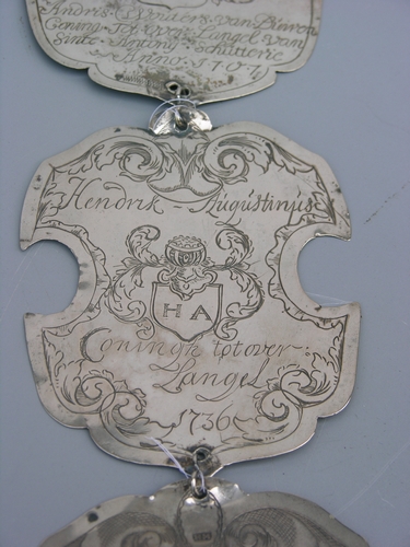 Koningsschild - 1736, materiaal: zilver, afmetingen: 11,5 x 9 x 0,2 cm, schildje c. dat deel uitmaakt van vier onder elkaar en met elkaar verbonden zilveren koningsschilden, centraal wapenschildje waarin de initialen 'HA' bekroond door een adellijk vizier met adelaar of zwaan en een symmetrisch acanthusblad, met het inschrift: 'Hendirk (sic) - Augustinus Coningh tot ...