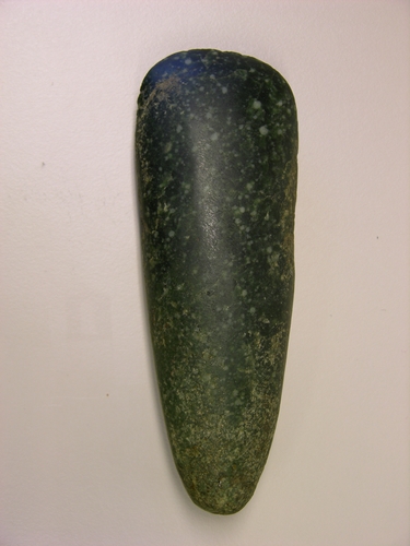 Geslepen natuurstenen bijl van westeuropees type. Gebruikte steensoort is een soort graniet. Vorm van de bijl is enigszins gerekt en meer afgerond dan gebruikelijk bij vuurstenen bijlen.. De voorzijde is door slijping afgeplat. Datering: Midden - Neolithicum (3200 - 2200 v. Chr.)