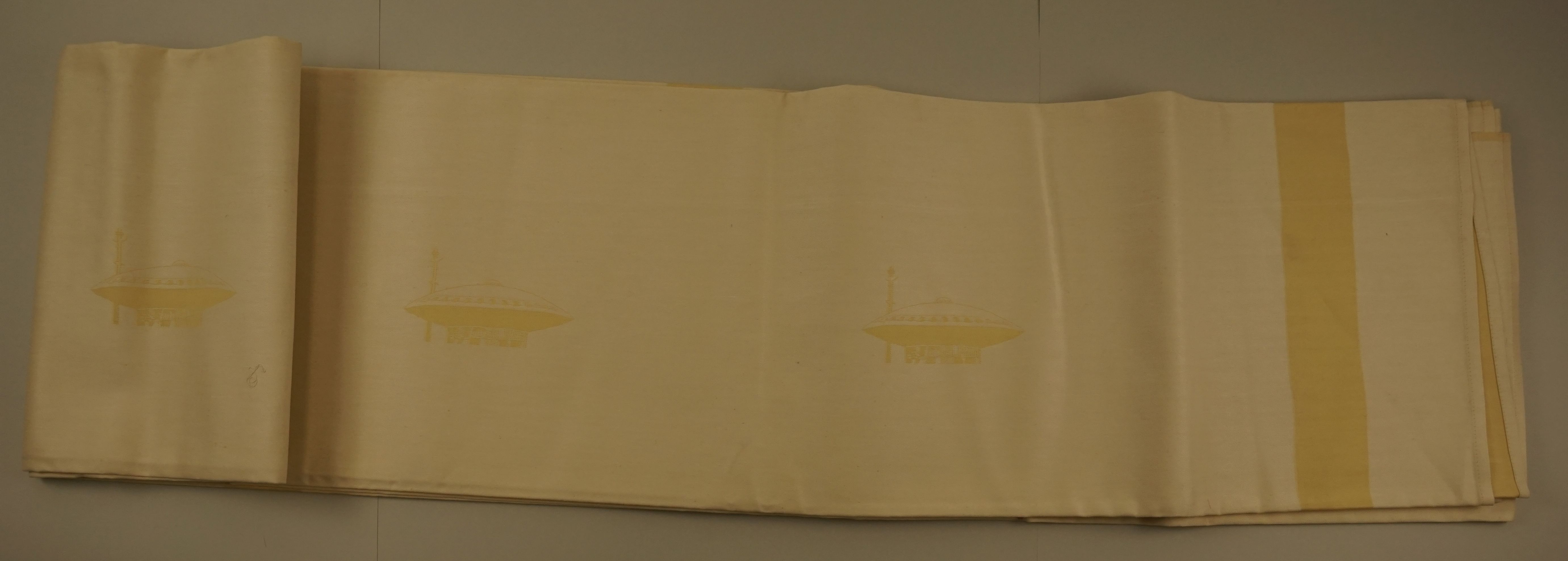 Tafellaken Evoluon, materiaal: linnen, kleur: wit met lichtgeel, lengte 530 cm, breedte 132 cm, bestaat uit 3 delen met randen, 3 x 6 'Evoluon' vignet