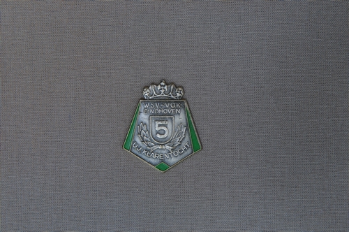 Wandeltochtmedaille WSV-VOK Eindhoven U.J. Klarentocht 5 - 20e eeuw, materiaal: metaallegering en emaille, afmetingen: 3,4 x 3 x 0,2 cm, medaille in vorm van een tekstschild met het opschrift: 'WSV-VOK Eindhoven U.J. Klarentocht 5', belettering in kapitalen, boven het tekstschild een kroontje