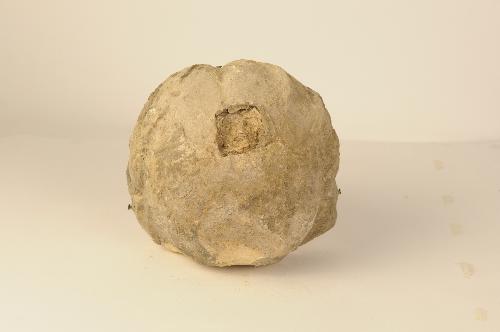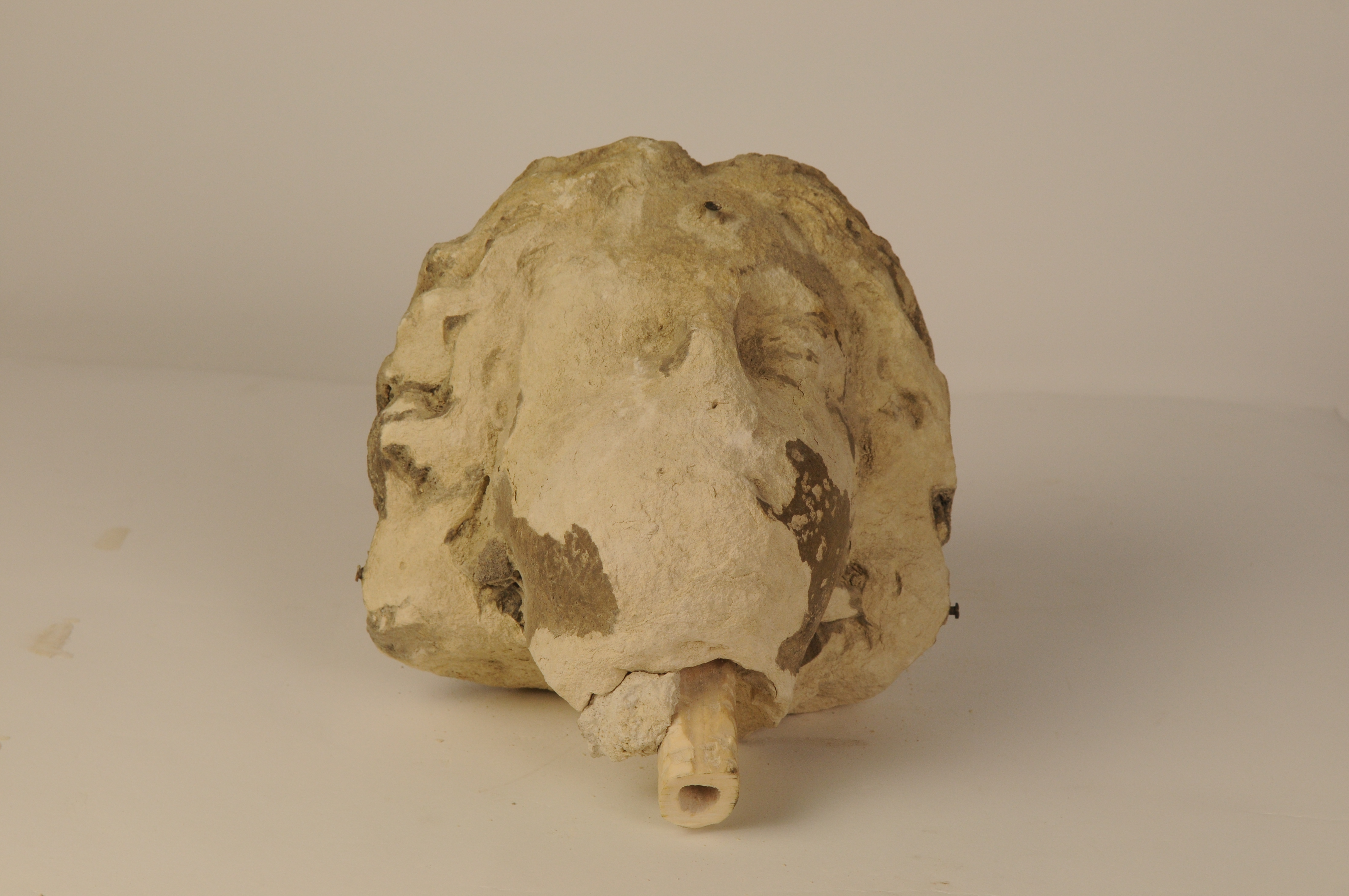 Kalkzandstenen hoofd van engelenbeeld afkomstig van de St. Catharinakerk te Eindhoven. Onderin de hals een deuvel (insteekpen)