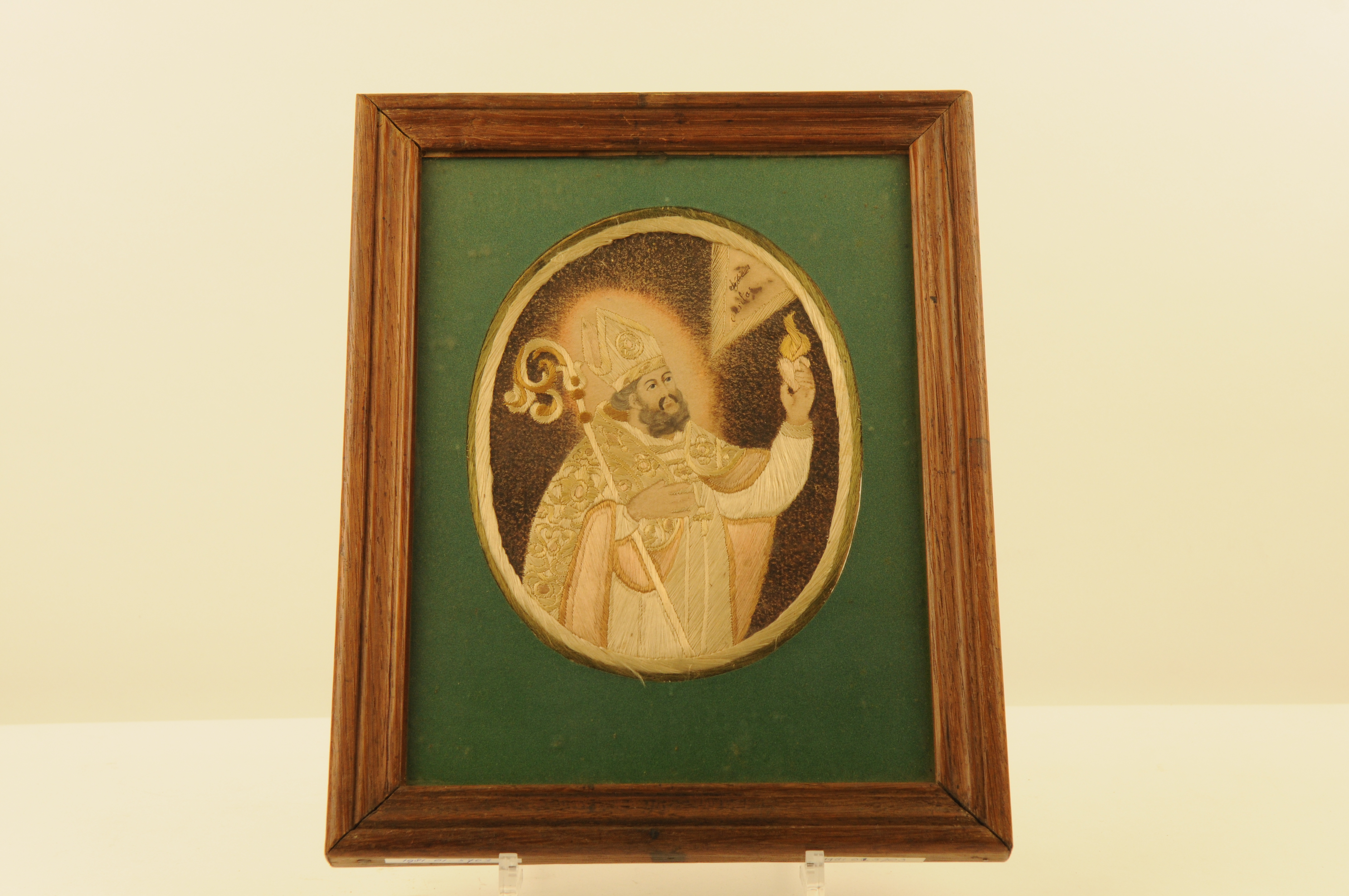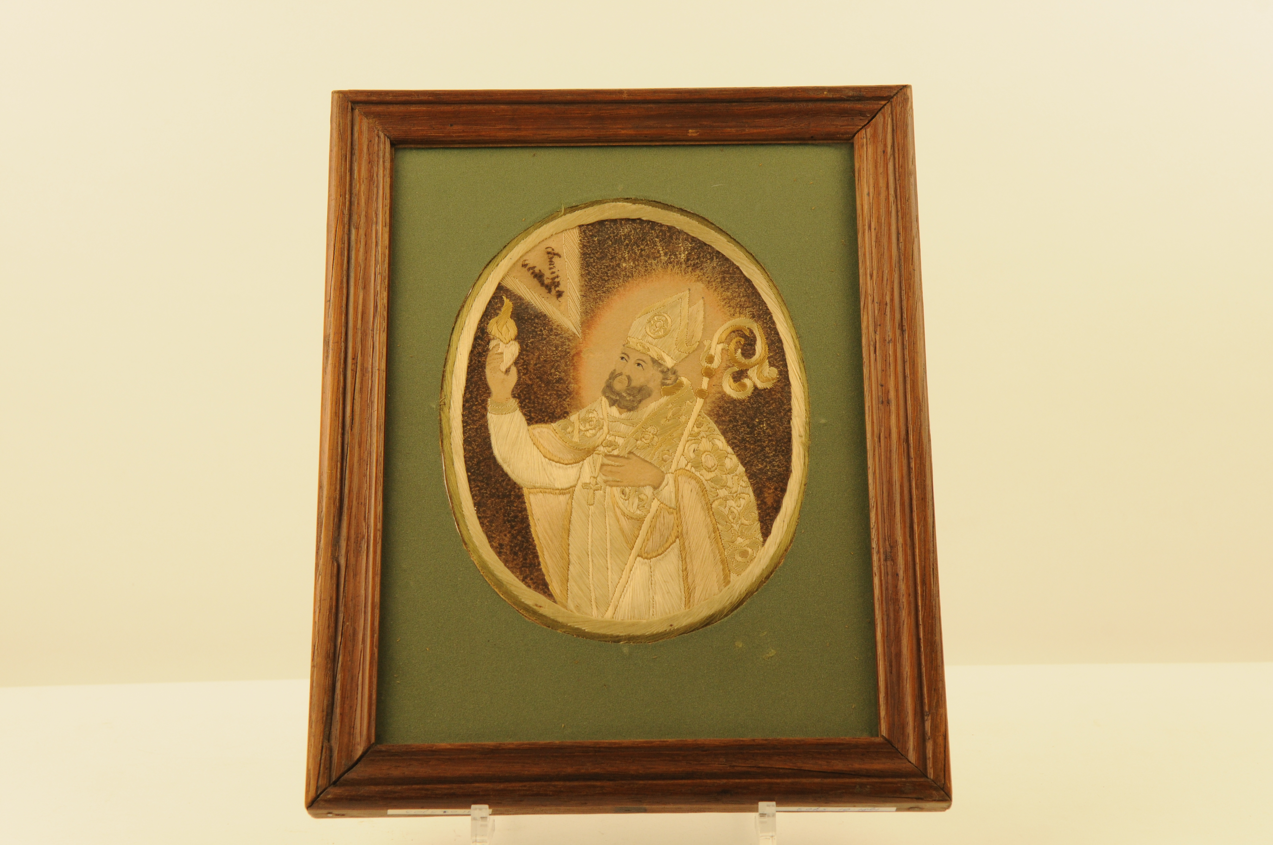 Sint Augustinus - 1e helft van de 19e eeuw, materiaal: textiel, glas, hout, papier en inkt, afmetingen: 29 x 23 cm, geborduurde voorstelling van de Heilige Augustinus. tweezijdig, spiegelbeeldig en gevat in een ovale uitsnede van groen karton of vilt (?), het gezicht van de heilige is met gekleurde inkt ingetekend. Augustinus is gekleed in ...
