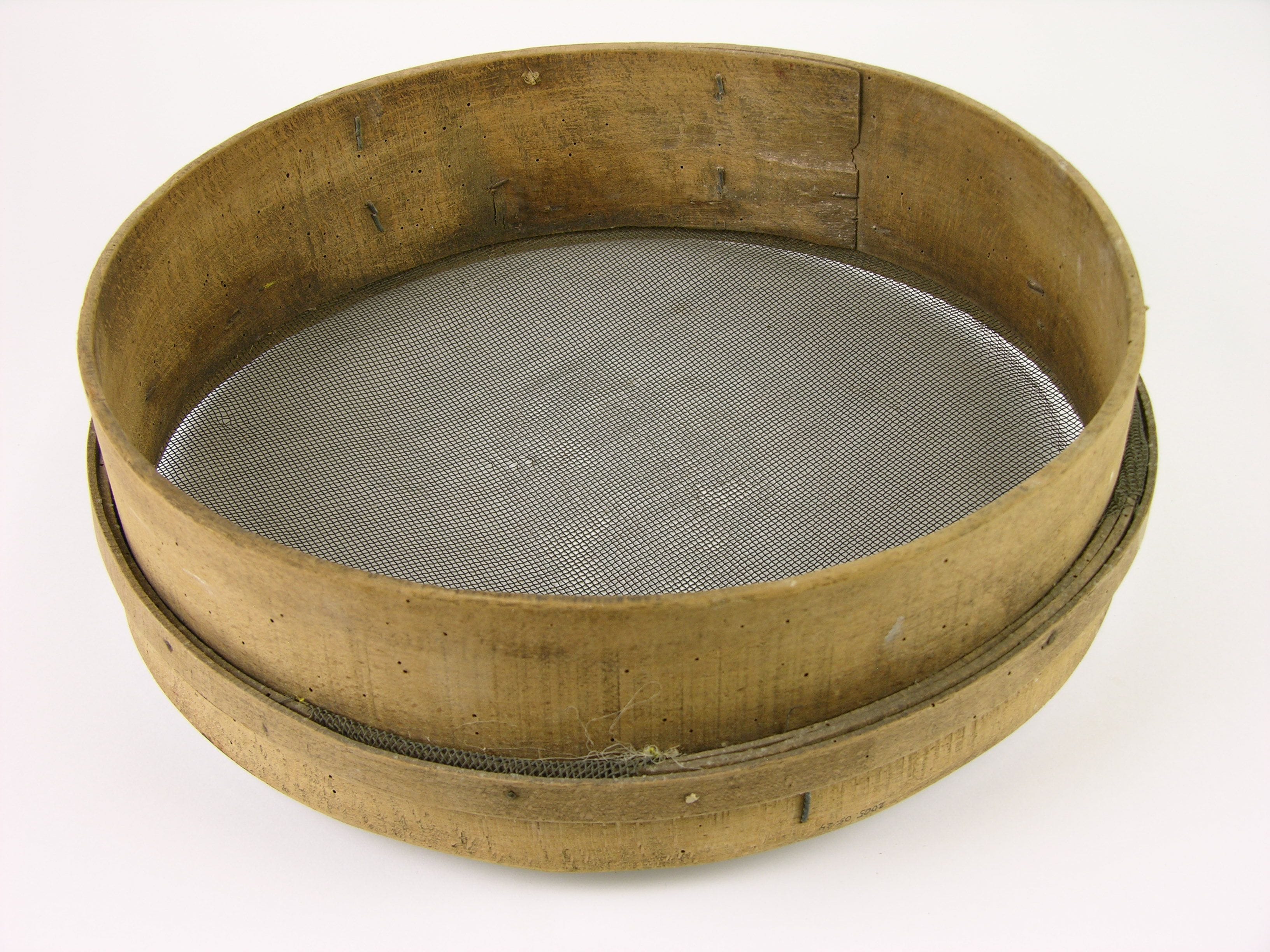 Meelzeef, materiaal: hout en ijzergaas, hoogte 10cm, diameter 38,5 cm