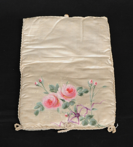 Envelop, materiaal: zijde, kleur: ecru, lengte 25 cm, breedte 37 cm, voorkant beschilderd met rozen, rondom afgezet met koord, twee hoeken met lussen, sluiting met lus en knoop