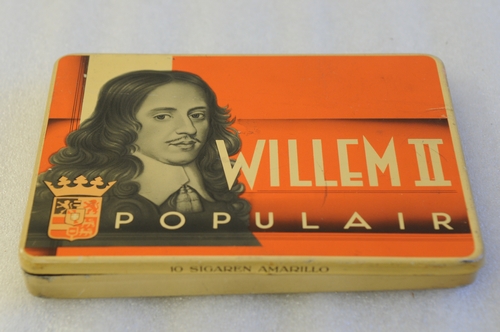 Sigarendoosje Willem II Populair 10 sigaren amarillo - jaren 1950, materiaal: blik, afmetingen: 1,5 x 12 x 16 cm, op het deksel een portret van willem II met gekroond wapen en de tekst 'Willem II Populair' , op binnenzijde deksel idem en twee gekroonde wapens met de vermelding 's-Hertogenbosch, Valkenswaard'