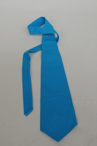 Stropdas – jaren 1980, materiaal: katoen, kleur; turquoise, afmetingen: 134 x 12 cm, opmerking: in huisvlijt vervaardigde (carnavals ?) stropdas