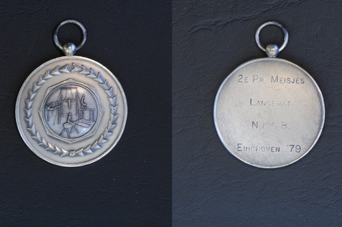 Prijsmedaille, turnmedaille, rmateriaal: zilver of verzilverd, ronde prijsmedaille met recto: medaillon met reliëfafbeelding van 5 turners oefenend op stellages en omlopend lauwerkransmotief, verso: inschrift: 2e Pr. meisjes Langemat N.K.G.B. Eindhoven '79, 52 x 40 x 3 mm, met doorboord knopje en draagringetje