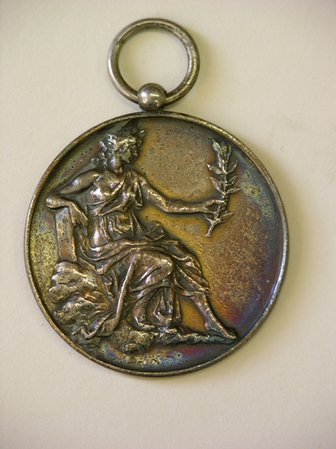 Ronde prijsmedaille/draagpenning met recto: in reliëf naar rechts gewende zittende vrouwenfiguur in antieke kleding, met in linkerhand lauwertak en de rechterhand leunend op stoelleuning. Verso: inschrift '1e Prijs 'Brug' G.V. Helmond 17-7-1910' Langs rand lauwertakken van eikenblad en laurier. Met doorboord knopje/draagringetje