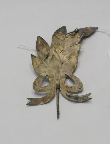 Lauwertak - 1935, materiaal: metaal, verzilverd, afmetingen: 11 x 5,5 x 1 cm, tienbladige lauriertak met twee vruchten en symmetrisch uitgewerkt banderole-lint met de inscriptie: ‘R.K. G. S.A.B. GELEEN 1910-1935 OPTOCHT 2E Pr.’