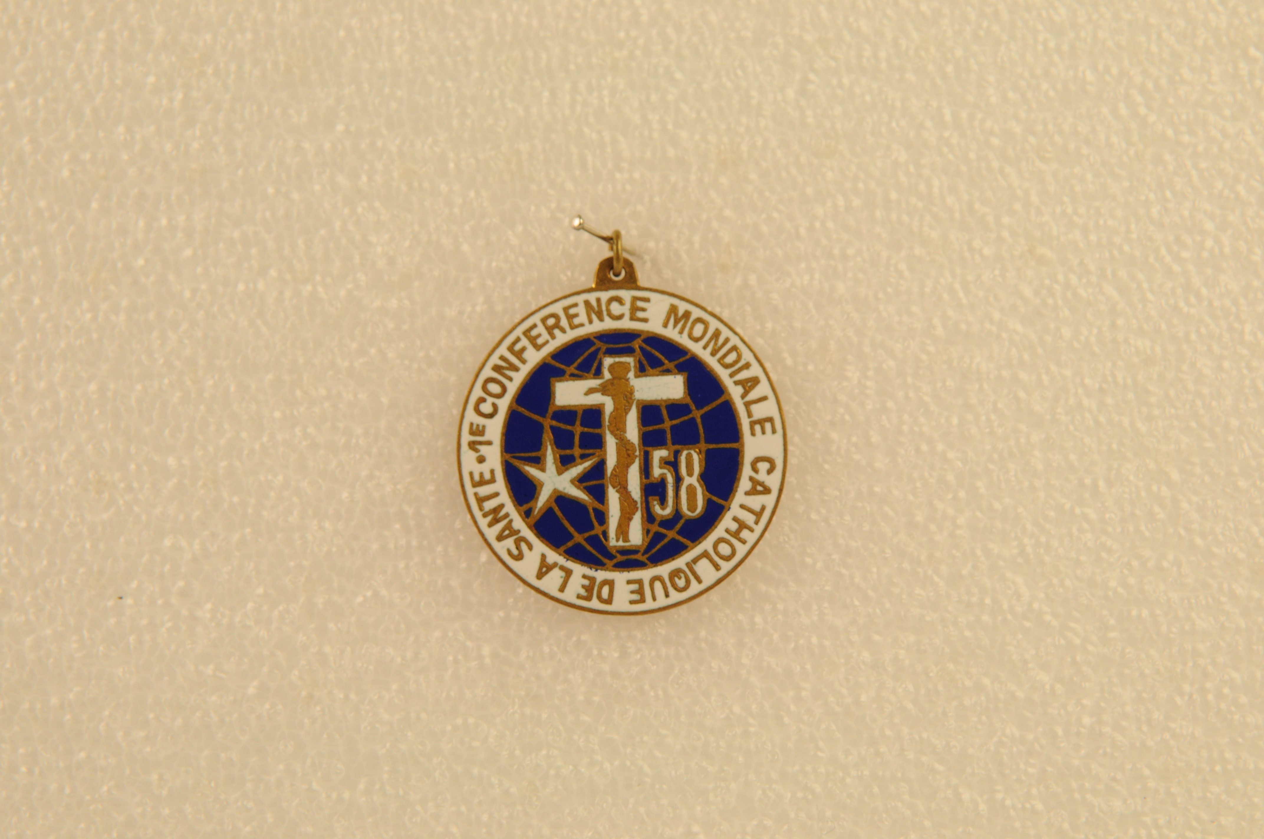Draagspeld 1e Conférence Mondiale Catholique de la Santé - 1958, materiaal: messing, geëmailleerd, afmetingen: 3,3 x 0,1 cm, ronde draagspeld met in de middencirkel tegen een blauw fond een afbeelding van een Asklepiosstaf (Aesculaapstaf) tegen een wit kruis, daarbij het jaartal '58' en een vijfpuntige ster, in kapitalen de randtekst: '1E CONFÉRENCE MONDIALE CATHOLIQUE DE ...