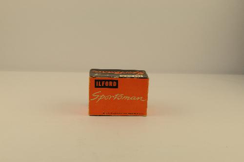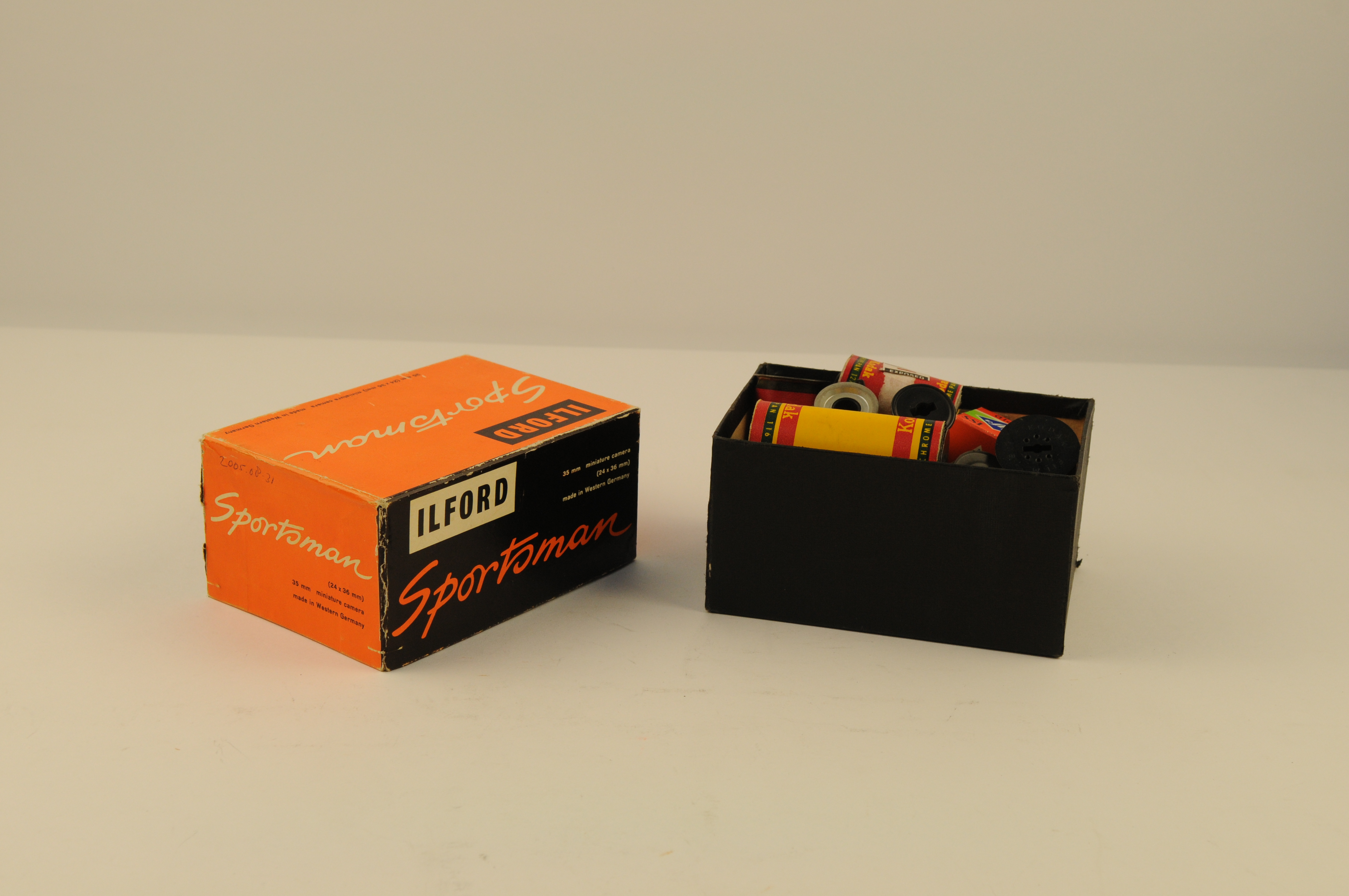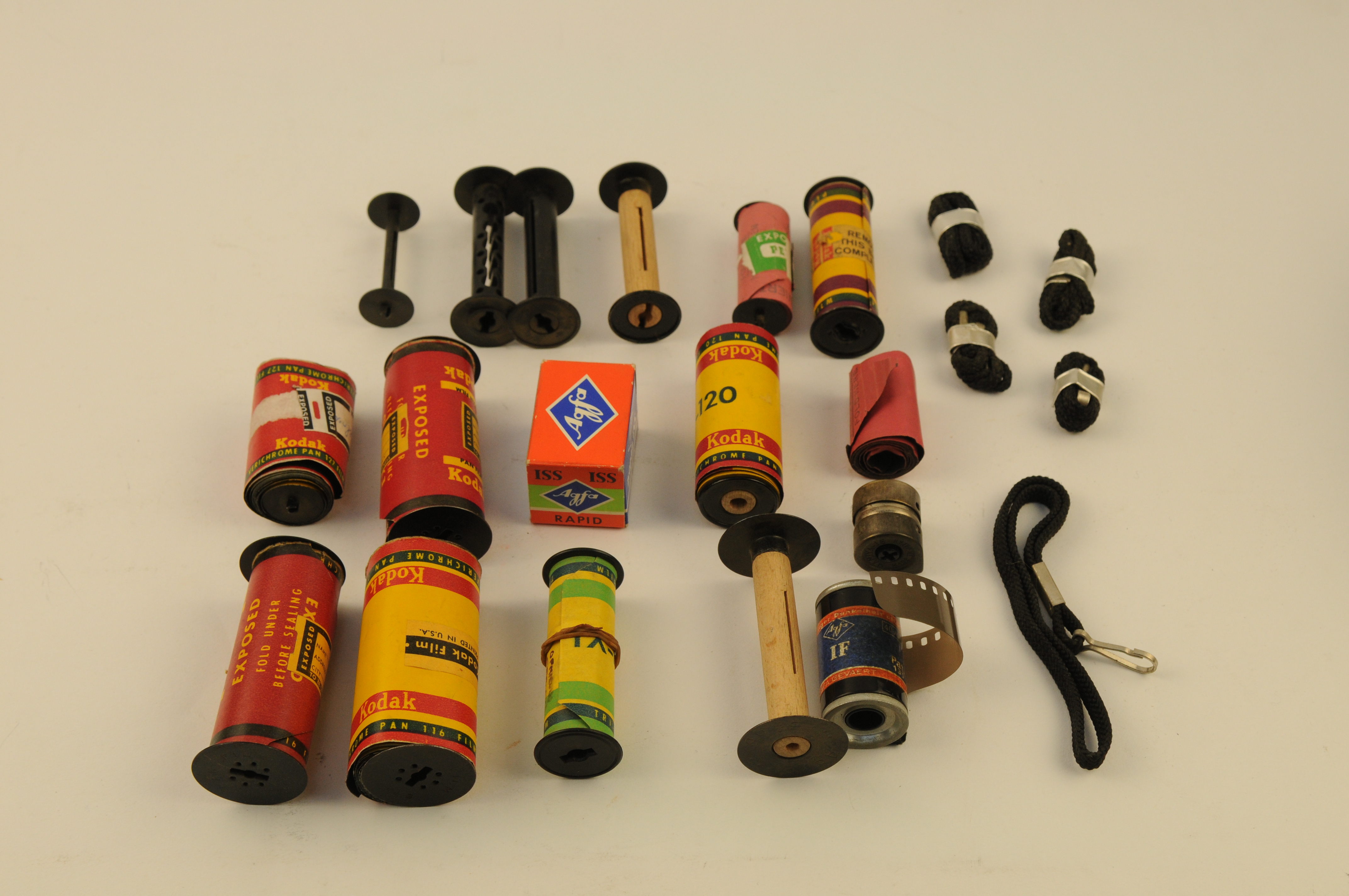 4 Kodak films (Kodak Pan), 1 Agfa filmpje, 1 onbekend filmpje, 1 Agfa Isopan filmpje in doosje, 4 lege spoeltjes, 4 dragkoordjes voor fototoestel in doosje met Ilford-opdruk en 3 Kodak filmpjes