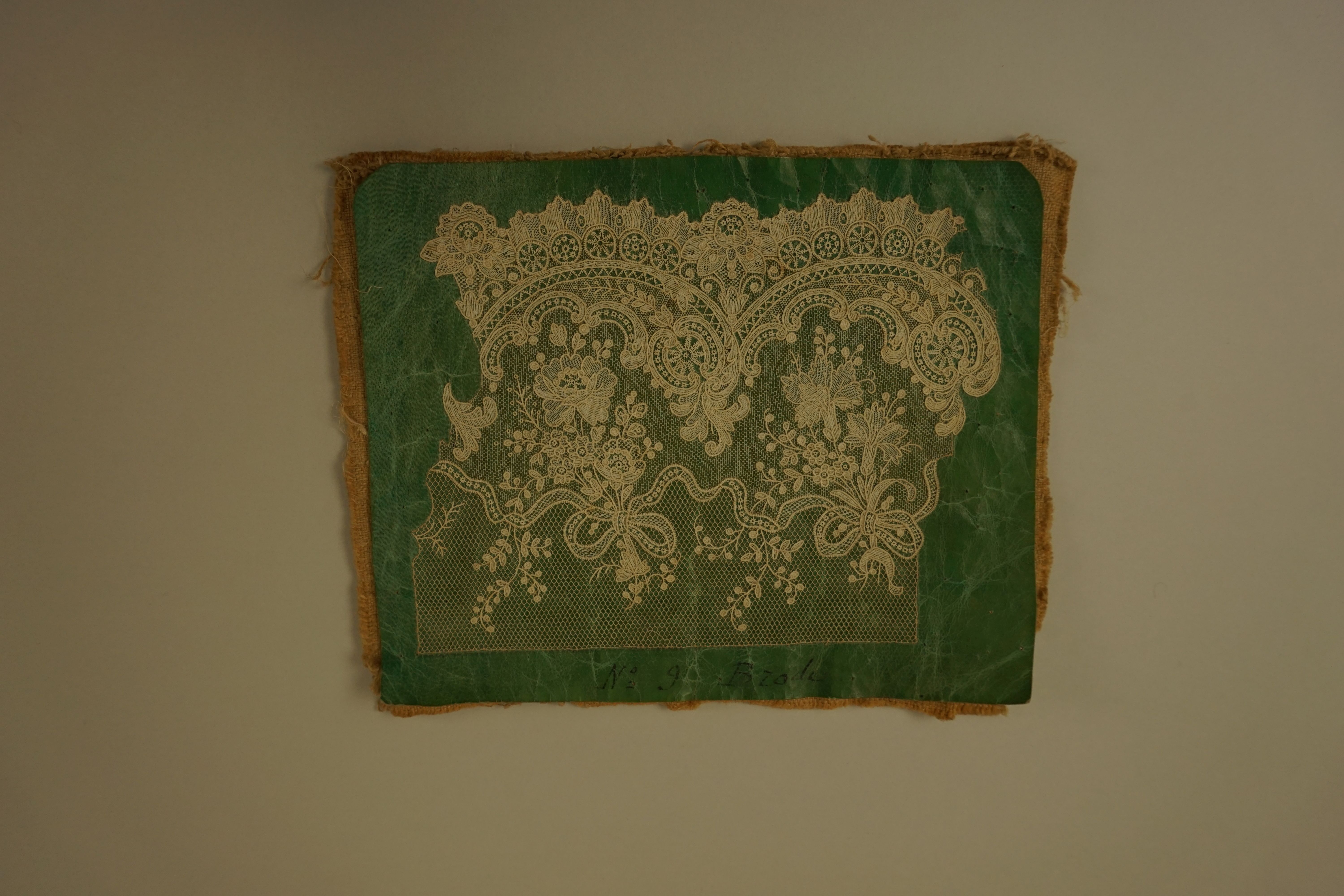 Kloskantpatroon - z.j., materiaal: papier en jute, kleur: groen/ecru, 18 x 22,5 cm, model: Brode nr 9, patroon genaaid op jute, de nrs 1 t/m 9 geven per fase de ontwikkeling van de kantvervaardiging aan