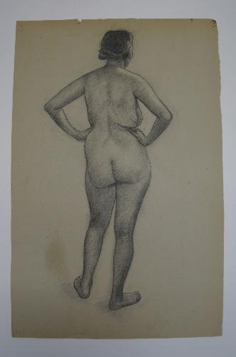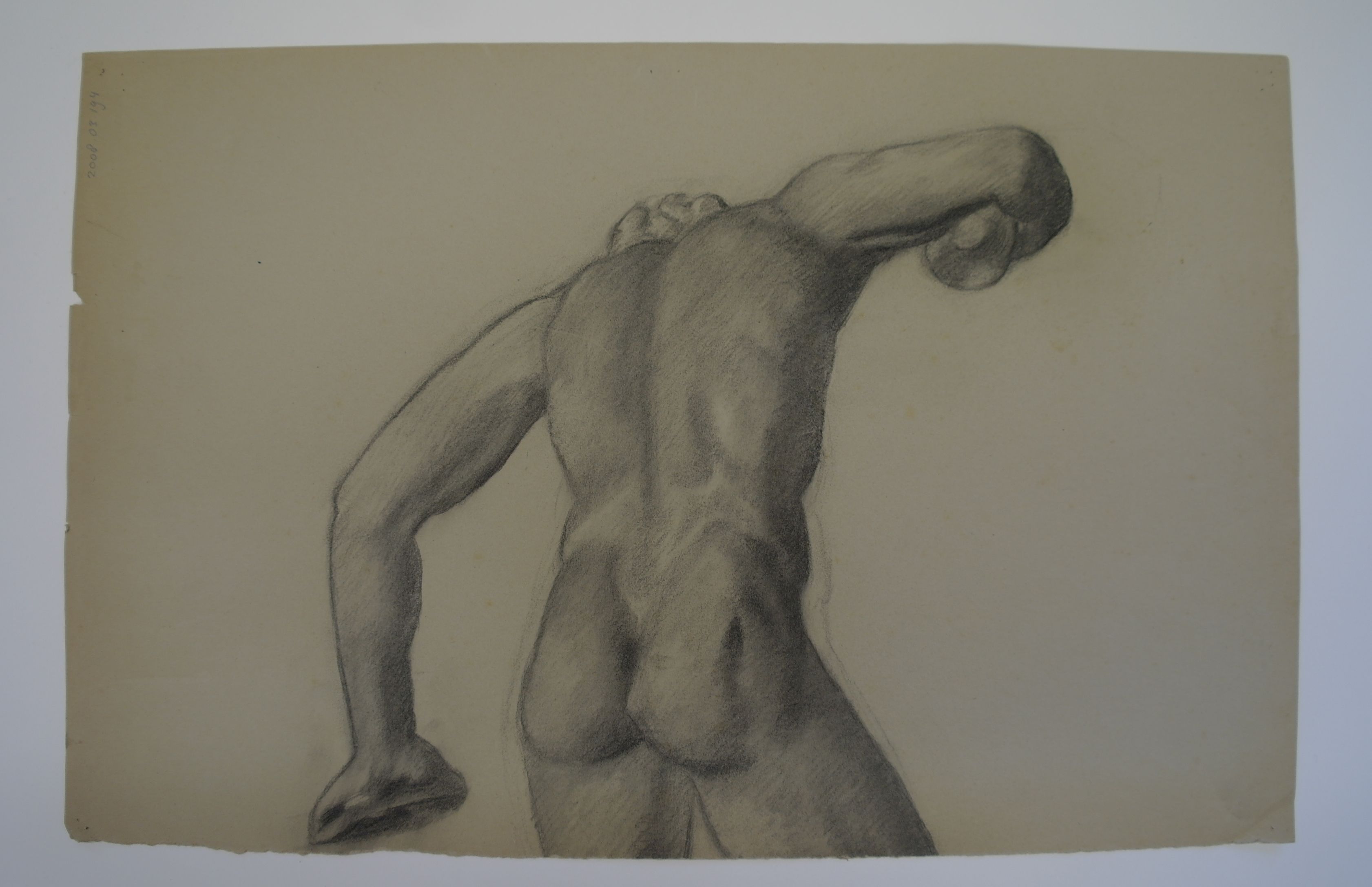Tekening van het naakte torso van een discuswerper, az: tekening van naakte vrouw, van achteren gezien.