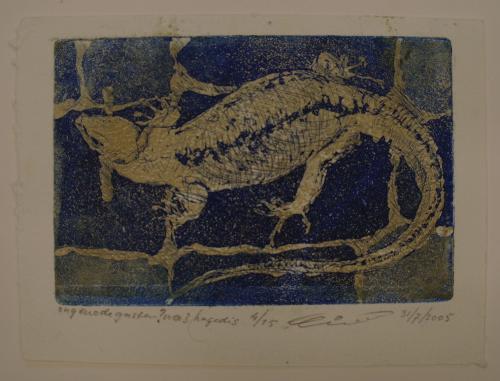 Ongenode gasten nr 3: hagedis – 2005, ets in kleur/papier (oplage 15), 98 x 148 mm, geannoteerd en genummerd in potlood l.o. onder plaat: ongenode gasten? no 3: hagedis 4/15, gesigneerd en gedateerd in potlood r.o. onder plaat: wied 31-7-2005