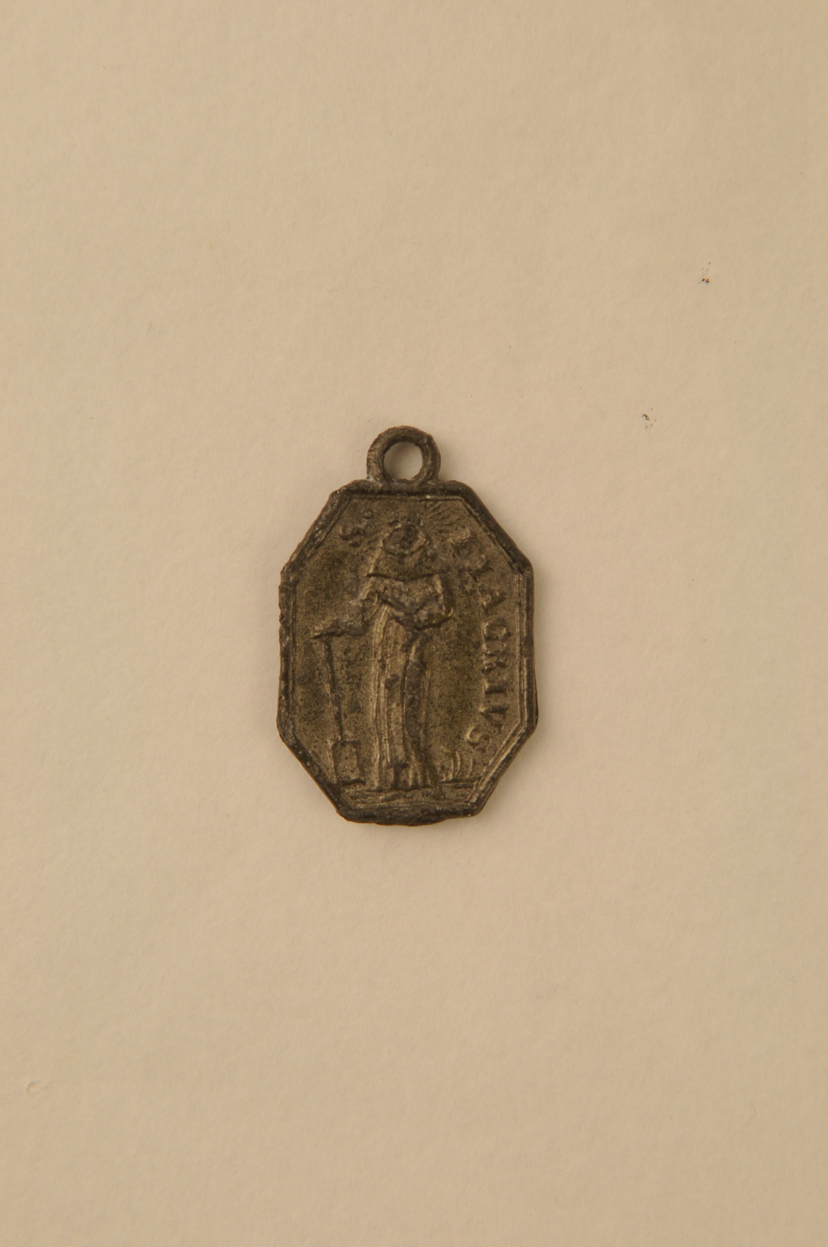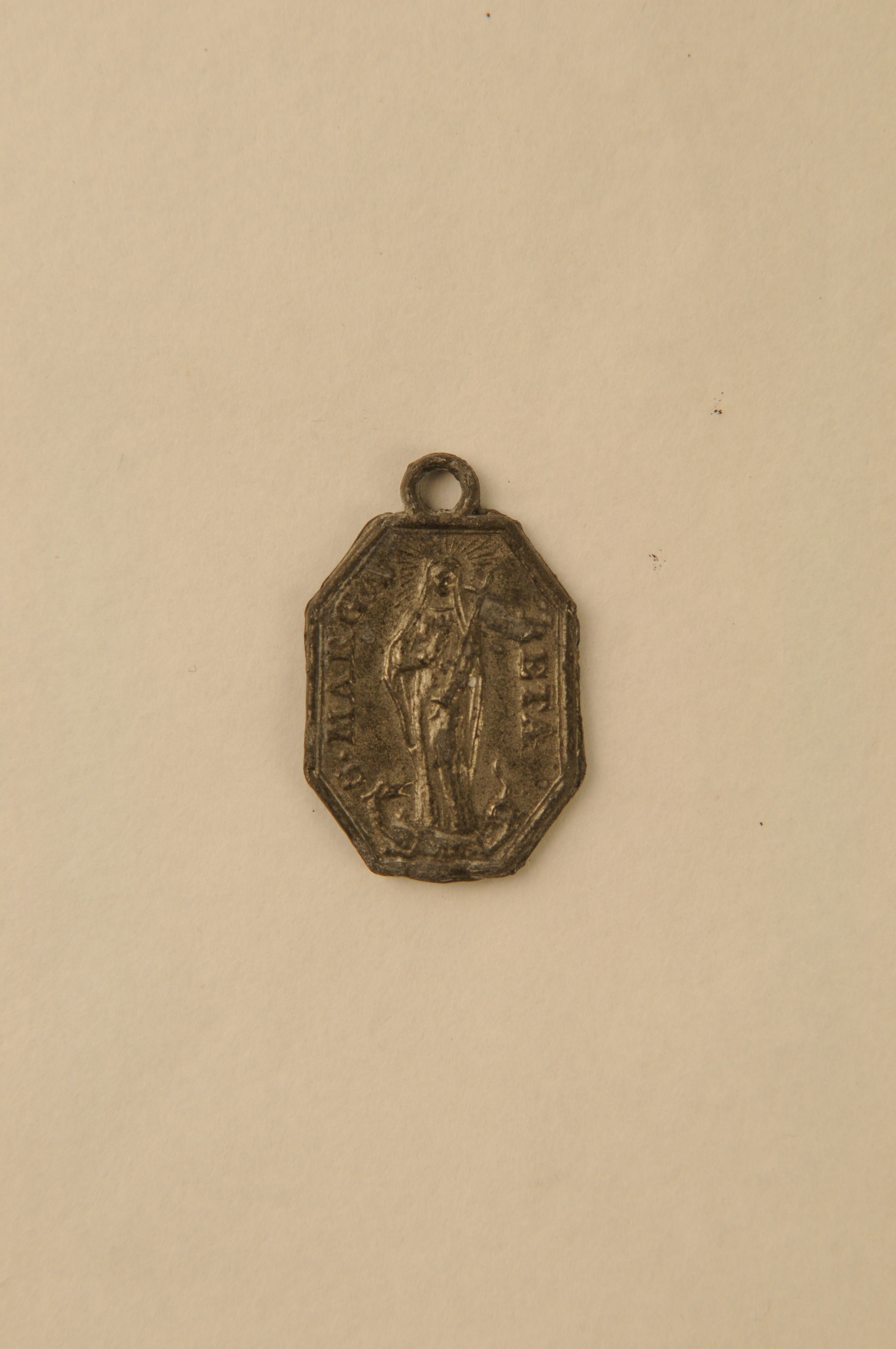 Religieuze medaille/draagpenning St. Margareta van Antiochië en St. Fiacrius van Meaux – z.j., tinlegering, achthoekige draagmedaille met op de vz. reliëfafbeelding van St. Margareta van Antiochië met kruis en draak, randschrift ‘S. MARGARETA’, op de kz. reliëfafbeelding van St. Fiacrius met spade, randschrift ‘S. FIACRIUS’, met ophangoogje, 3,5 x 2,3 x 0,2 cm