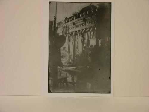 Rijk gemeubileerd interieur - omstreeks 1886, zwart-witfoto/barietpapier (FBG 221), 375 mm x 260 mm, Centraal op de foto een rijk versierde kapstok/buffet, waaraan en waarop aardewerken kruiken en vazen. Op de tafel links een parasol. Op de voorgrond links wellicht een schildersezel (atelier ?) in passe-partout, Volgnummer 219 (FBG 221) negatiefnummer 89.6.10-4.3 afmetingen oorspronkelijke foto 16,8 ...
