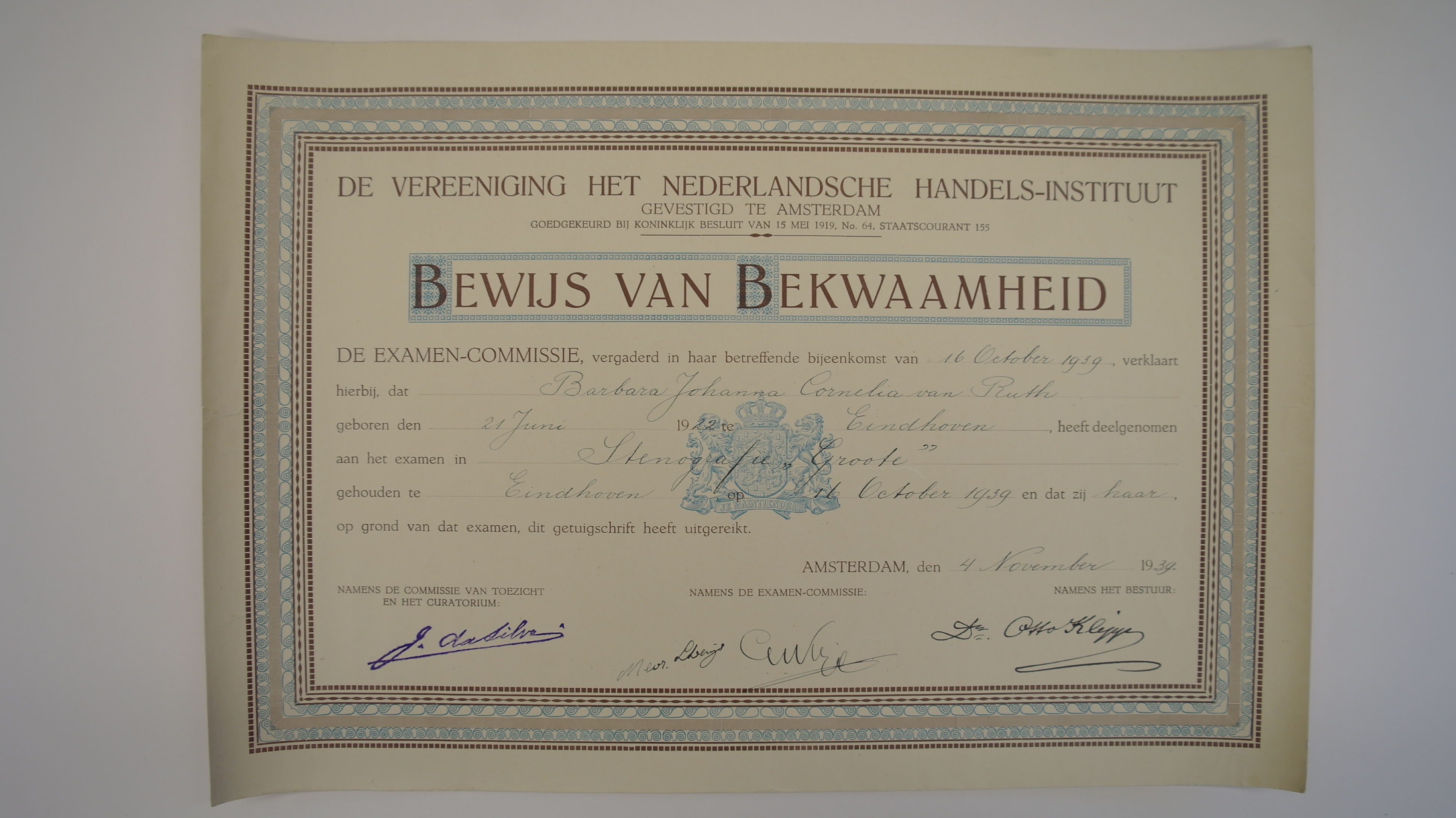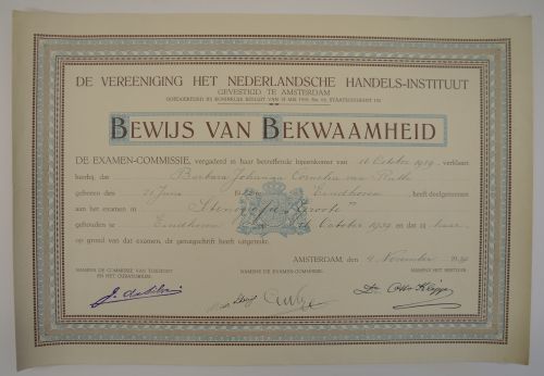 Bewijs van bekwaamheid voor het afleggen met goed gevolg van examen stenografie aan Mej. B.J.C. van Ruth in 1939