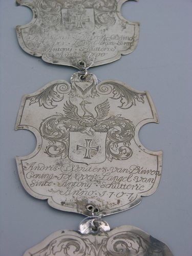 Koningsschild - 1707, materiaal: zilver, afmetingen: 11,7 x 9,5 x 0,2 cm, schildje b. dat deel uitmaakt van vier onder elkaar en met elkaar verbonden zilveren koningsschilden, centraal wapenschildje met een gelijkarmig kruis bekroond door een adellijk vizier met adelaar of zwaan en een symmetrisch acanthusblad, met het inschrift: 'Andris. Wouters. van. Duinen. Coning. Tot. ...