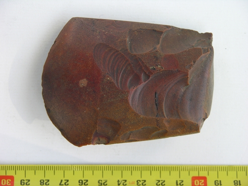 Geslepen bijl van grijze vuursteen met diep roodbruine ijzerverkeuring (Heeft zich in B-laag bevonden), van het westeuropees type met beschadigingen/sporen van hergebruik op de boven- en de onderkant. Deze vlakken van de bijl zijn ruw bewerkt gelaten. Achterzijde van de bijl is afgebroken. Datering Midden - Neolithicum (ca. 3200 - 2200 v. Chr). Op de bijl ...