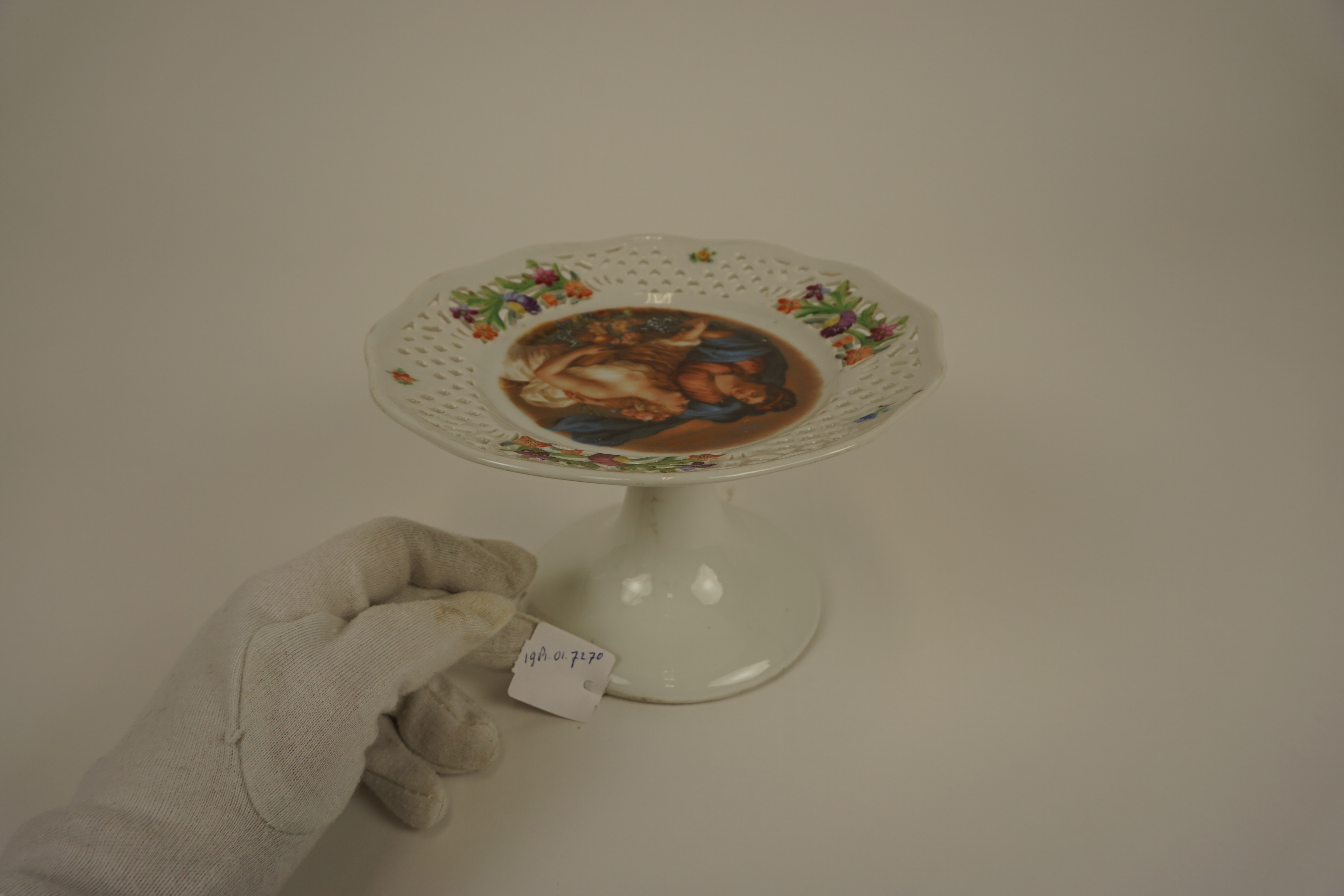Serveerschoteltje voor bonbons (geen bonbonnière), opengewerkt bovendeel met decoratieve bloemen en centraal een kleurafbeelding van twee vrouwenfiguren met bloemen en vruchten. Het schaaltje rust op een gebogen standvoet en is licht gelobd. Onderzijde bovendeel bevat stempel 'Schumann Dresden'