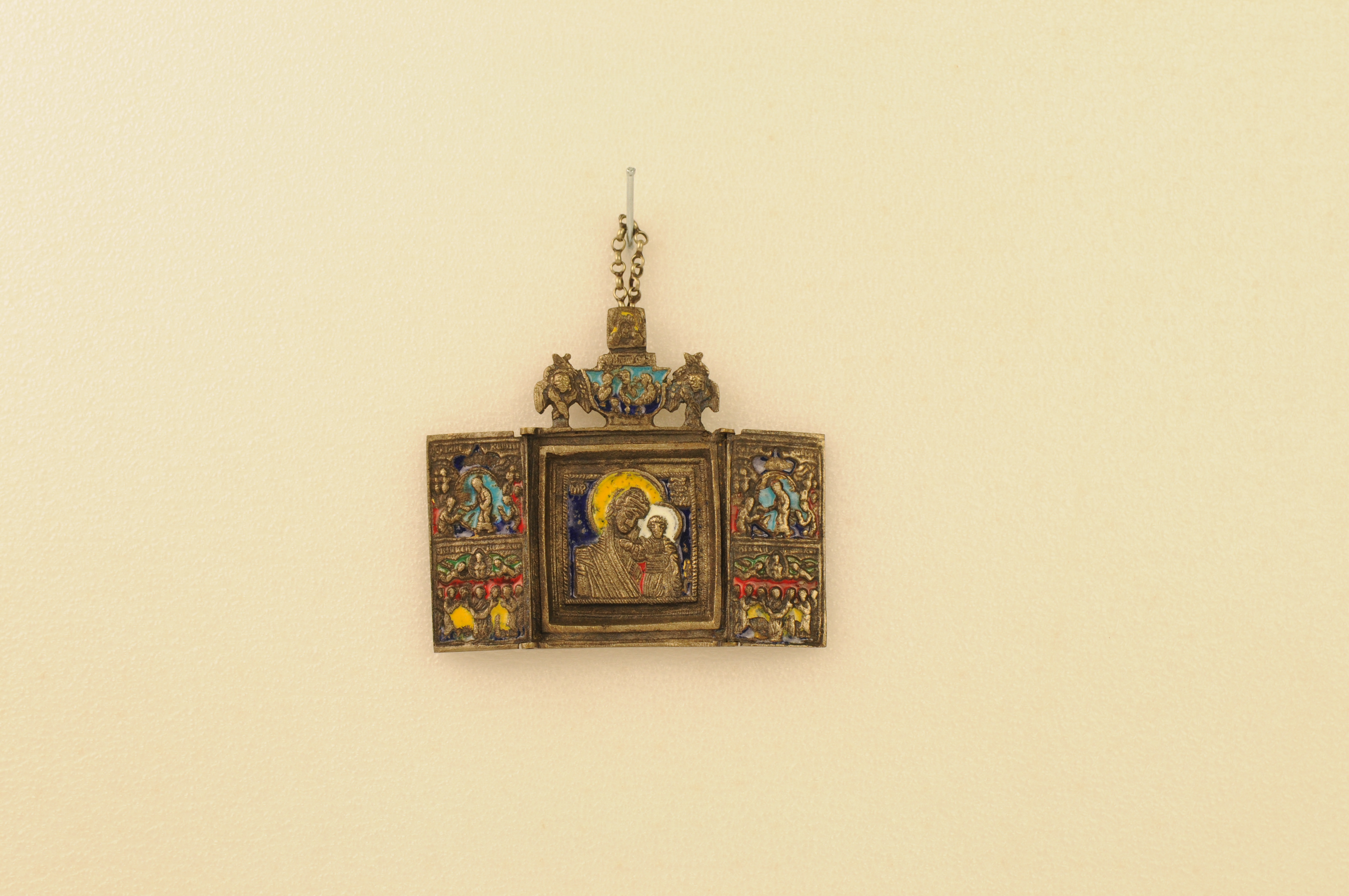 Reis-ikoontje, drieluikje, metaallegering met vijfkleurig email, centraal Moeder Gods met kind, op de zijluikjes 2 x 2 afbeeldingen: bovenaan serafijnen met mandelion + drie ' figuren'. Aan draagkettinkje