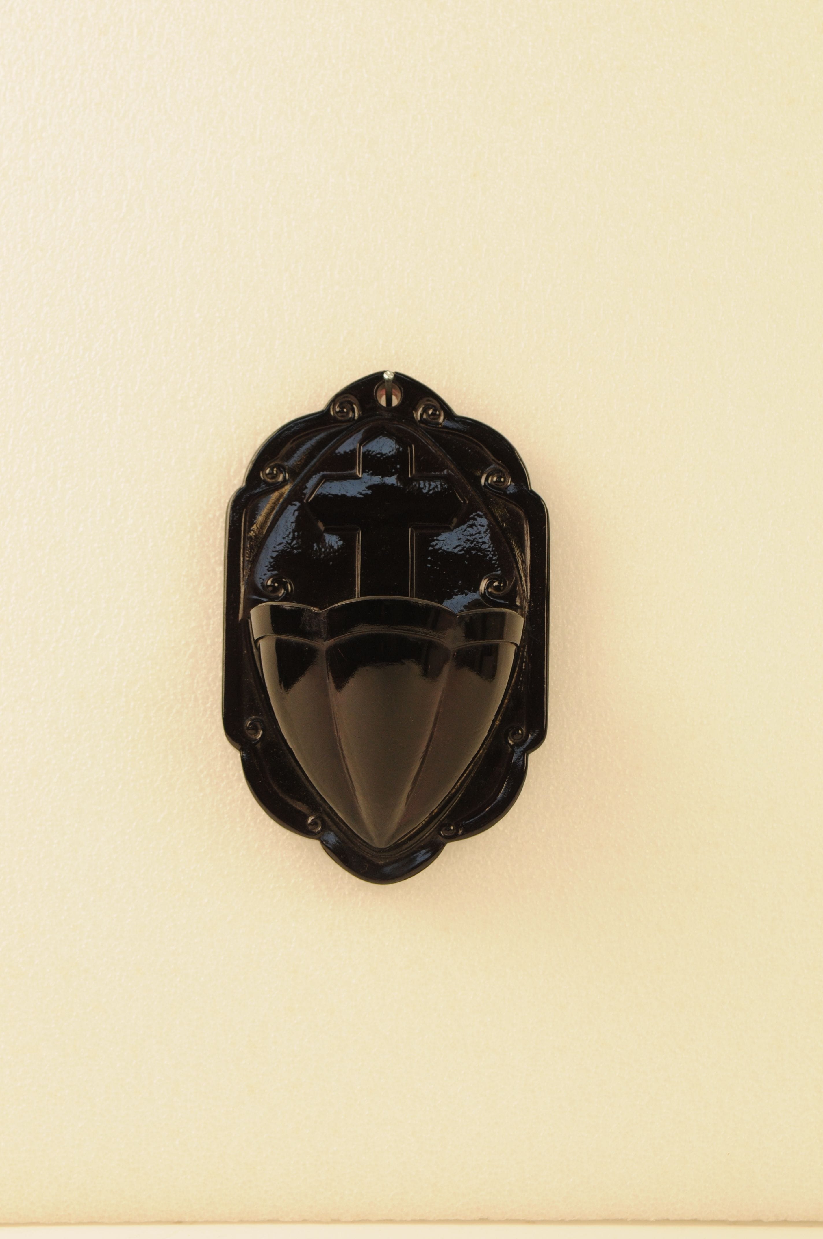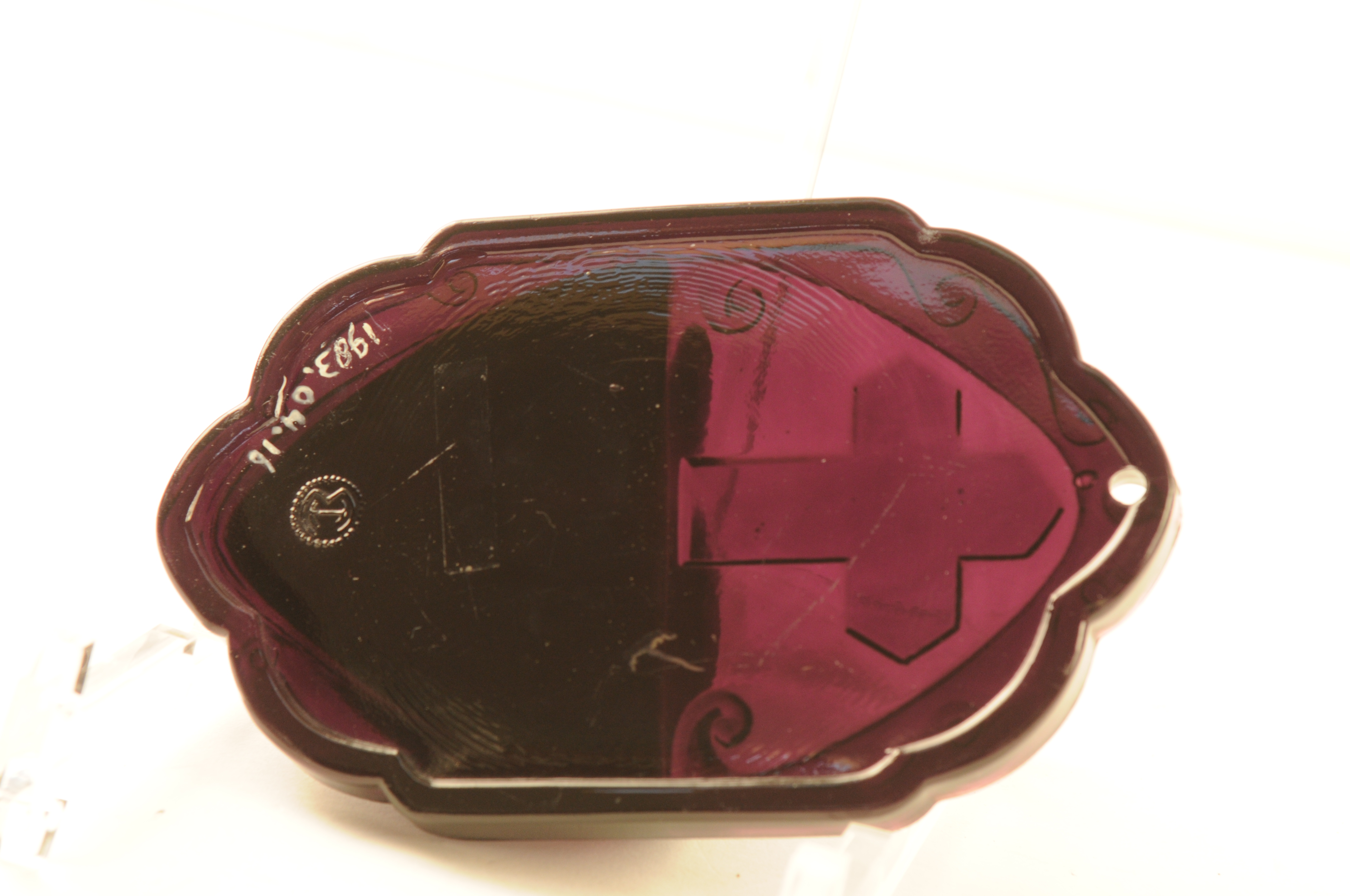 Wijwaterbakje in donkerpaars glas met Art-Deco-elementen en op de achterkant in een kleine cirkel een merkteken: gestileerde letter E waarbinnen een hoofdletter I. In de spitsboog boven het eigenlijke bakje is een reliëfkruis in het glas verwerkt.