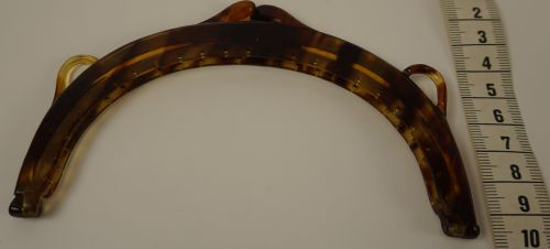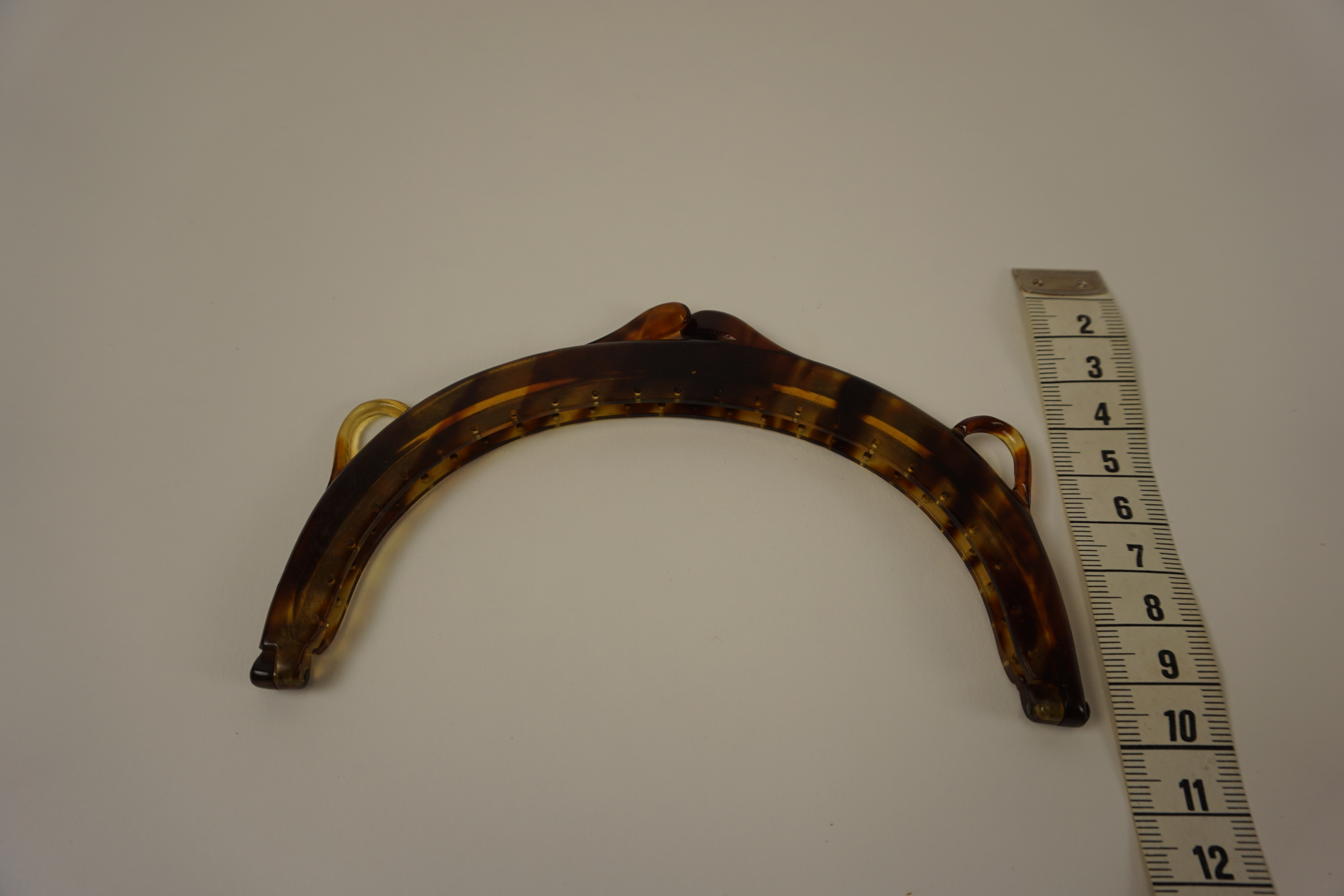 Beugel van tasje - 1e t/m 3e kwart van de 20e eeuw, materiaal: celluloid, afmetingen: 9 x 13,3 x 0,5 cm, tasbeugel bestaand uit twee scharnierende helften met gaatjes langs de onderranden om het eigenlijke tasje van textiel aan te bevestigen