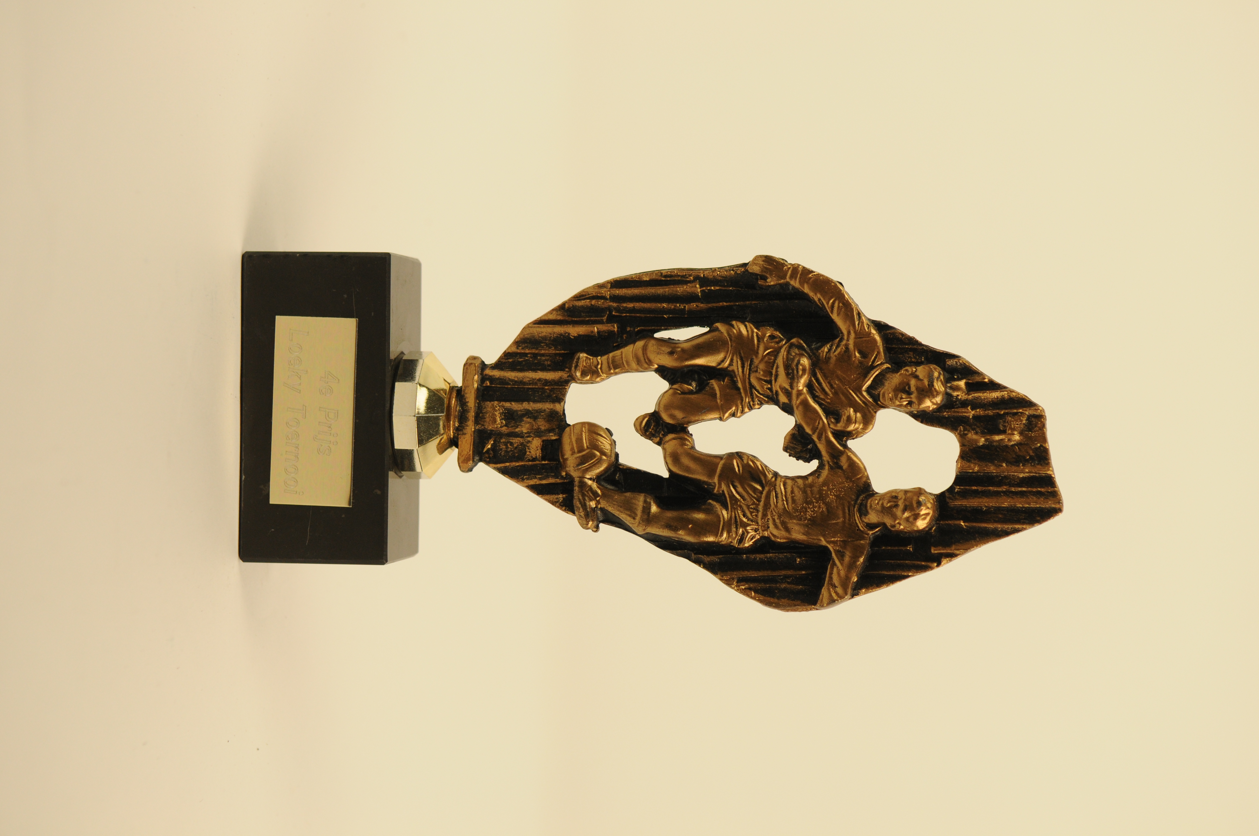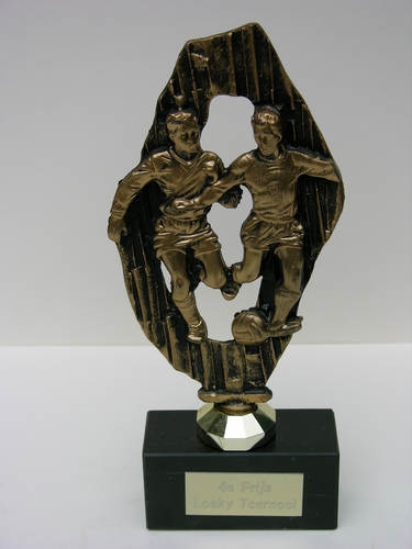 Prijstrofee voetbalvereniging RKSV, standblok met daarop in metaallegering uitgevoerd reliëf voorstellende twee voetballende jongens in tenue. Opschrift voetstuk: “4e prijs Loeky toernooi”, onderop een sticker met “HSA Baarle – St. Antonis (sportprijzen)” Prijstrofee voetbalvereniging RKSV, standblok met daarop in metaallegering uitgevoerd reliëf voorstellende twee voetballende jongens in tenue. Opschrift voetstuk: “4e prijs Loeky toernooi”, onderop een ...