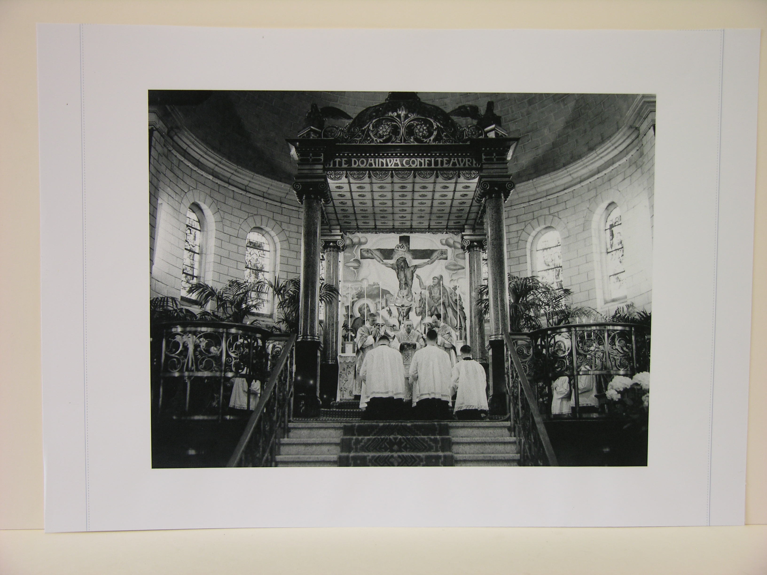 Plechtige mis in de St. Antonius van Paduakerk (de z.g. “Steentjeskerk”) in Eindhoven-Strijp, ter gelegenheid van het gouden priesterfeest van pastoor P. Pulskens, 1952, zwartwit-print/papier, 300 x 400 mm., foto: coll. Regionaal Historisch Centrum Eindhoven Fotoprints bij expositie 'Geloven in Eindhoven', n.a.v. Open Monumentendag 2005, in passe-partout, telkens twee prints in 1 passe-partout