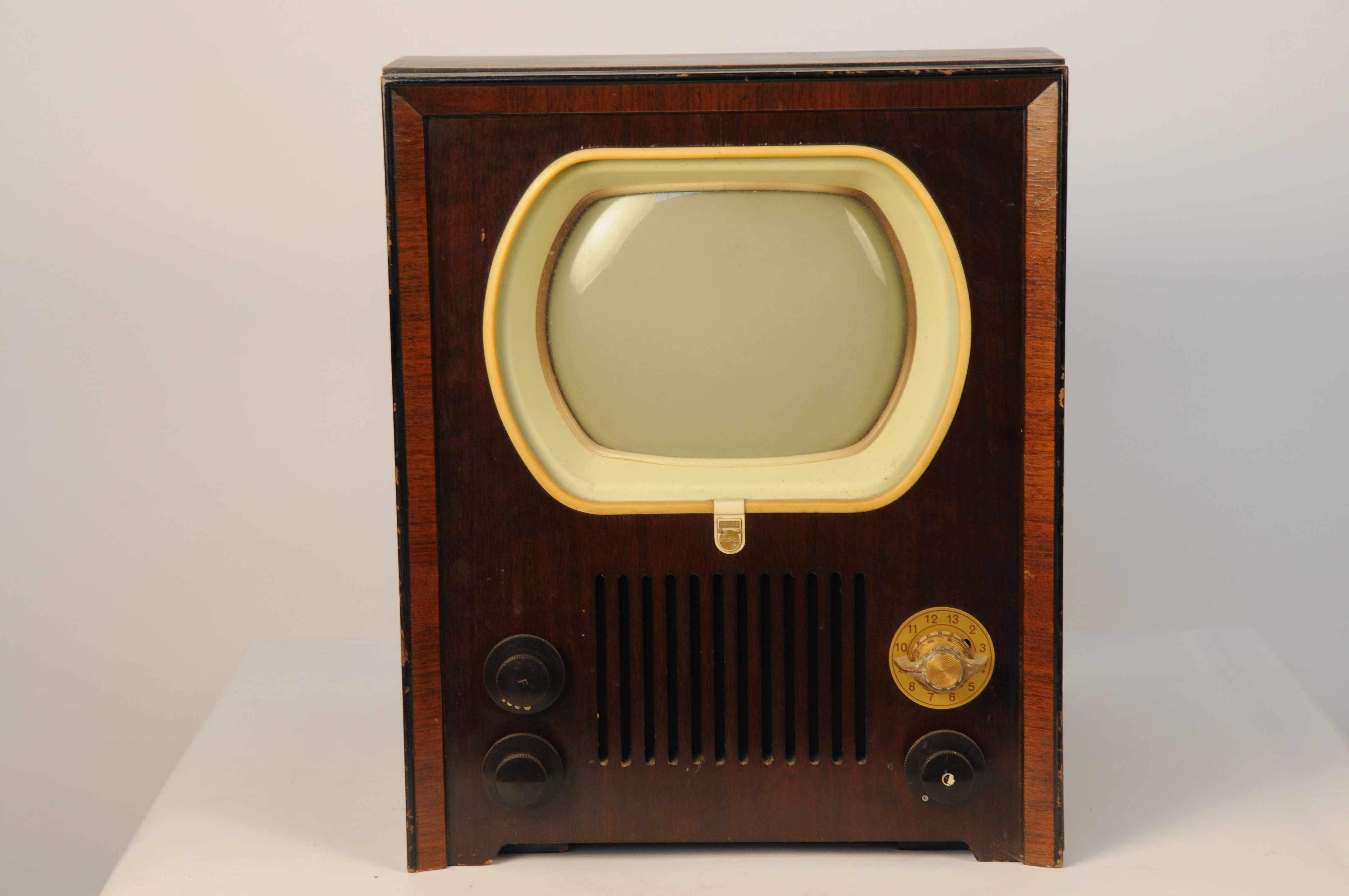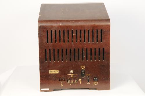 Televisietoestel (zwart-wit televisie), Materialen: hout, glas, plastic, bakeliet, karton, triplex, 46 x 43 x 37,5 cm, mahonie-gefineerd, afgeplatte ovaalvormige beeldbuis, type TX 400U-01, nr. E 31646 (A 187199 150 W.)