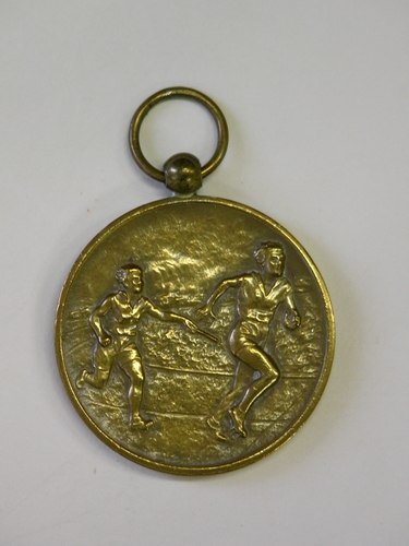 Ronde draagmedaille, prijspenning met doorboord knopje en draagringetje. Recto: reliëfafbeelding van twee hardlopende jongens. Verso: inschrift '4x 60 m. 3e Pr.' Omlopende lauwerkrans langs de rand