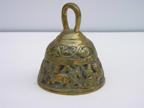 Koperen/messing altaarbel met lus-vormige handgreep. Reliëf opschrift op rand luidt: 'MARCUS, MATTHEUS, JOHANNES, LUCAS' (in kapitalen). daronder in reliëf de symbolen van de vier evangelisten. opschrift: Marcus Matheus Johannes Lucas hoort bij schenking 1996.11.29 t/m 1996.11.42 en 1996.11.311 t/m 1996.11.313