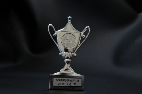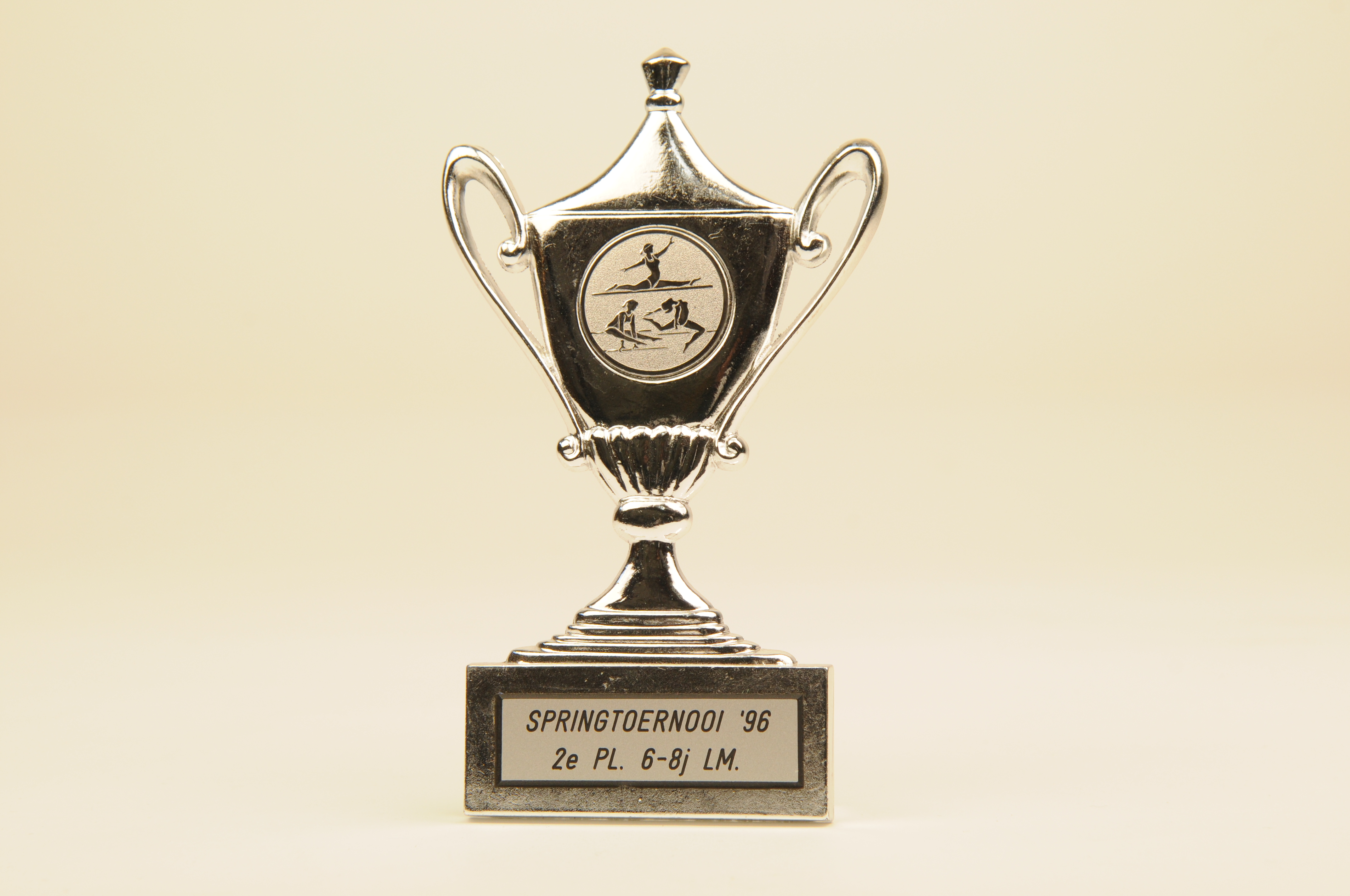 Prijstrofee Eindhovense Turnvereniging - 1996,prijstrofee in de vorm van een amfoor (met twee grepen) uit één stuk, opschrift basis: 'Springtoernooi '96 2e PL. 6-8 j. LM.' , ingelegd medaillon met een afbeelding van drie turnsters, plaketiketje: 'Sportprijzen/graveerinrichting Pedro van Heumen Koornstraat 44 Oss' Prijstrofee Eindhovense Turnvereniging - 1996, materiaal: metaal, kunststof en perspex, afmetingen: 13 x ...