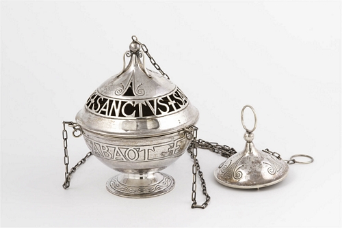 Merken: meesterteken Jacques (J.C.J.) Wijnhoven (Meestertekens, deel II nr 2053), werkzaam te Eindhoven van 1933-1973, jaarletter E = 1939, minervakopje (K= 's-Hertogenbosch)_, gehalteteken staande leeuw. In bovendeksel: in ajour: Sanctus, sanctus, sanctus. Inscriptie op onderdeksel: Dominus Deus Sabaoth. Hierbij horen lepeltje (1995.01.04 b) en scheepje (1995.01.04 c)